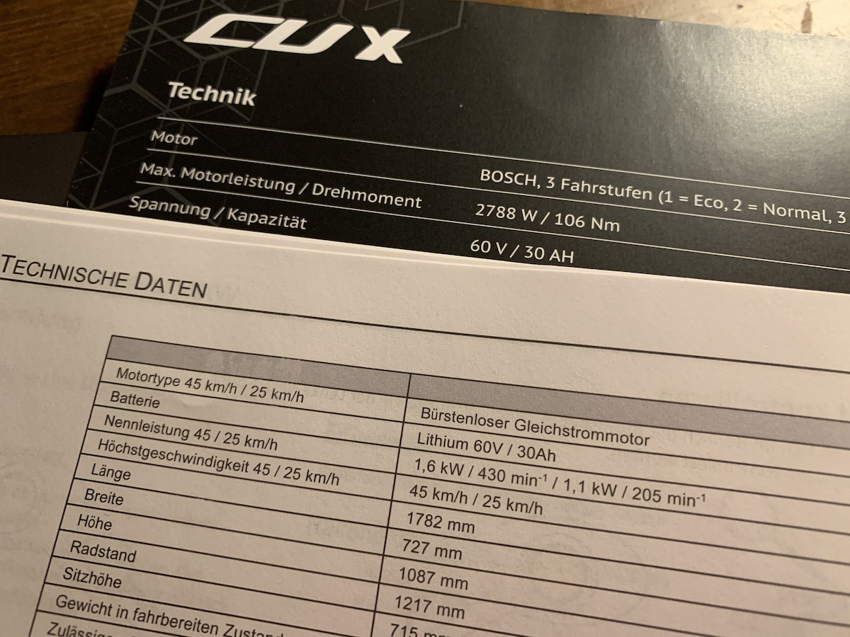 a) mein 2019er hat in der CoC und auf dem Typschild am Roller 1,6 kW stehen. Von 1300 Watt war m.W. nie die Rede. -- Ja, genau, das habe ich da auch stehen (1,6 kW bei 430 U/Min). Das mit den 1300 Watt kenne ich nur von verschiedenen Webseiten und Artikeln, z.B. hier: "Von außen sieht man der neuen Super Soco CUx die Neuerungen nicht an. Neu ist dagegen der bürstenlose Bosch-Radnabenmotor, der nun eine höhere Leistung bietet: Die Nennleistung steigt von 1300 Watt auf 2000 Watt, die Maximalleistung von knapp 2800 Watt hat sich nicht geändert" (https://elektromobilberater.de/2019/11/ ... e-cux-vor/). Oder: "The motor, still produced by Bosch, is much more powerful, going from 1300 W to 2000, with a peak power of 2788 W" (https://evnerds.com/electric-vehicles/e ... icma-2019/). Auf UK Seiten werden offenbar immer noch 1300 W gelistet: https://www.supersoco.co.uk/bike/cux/