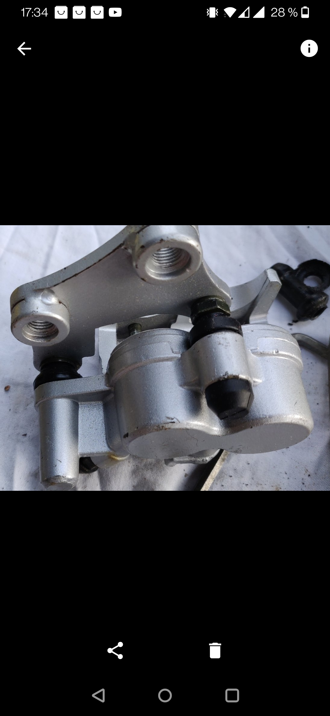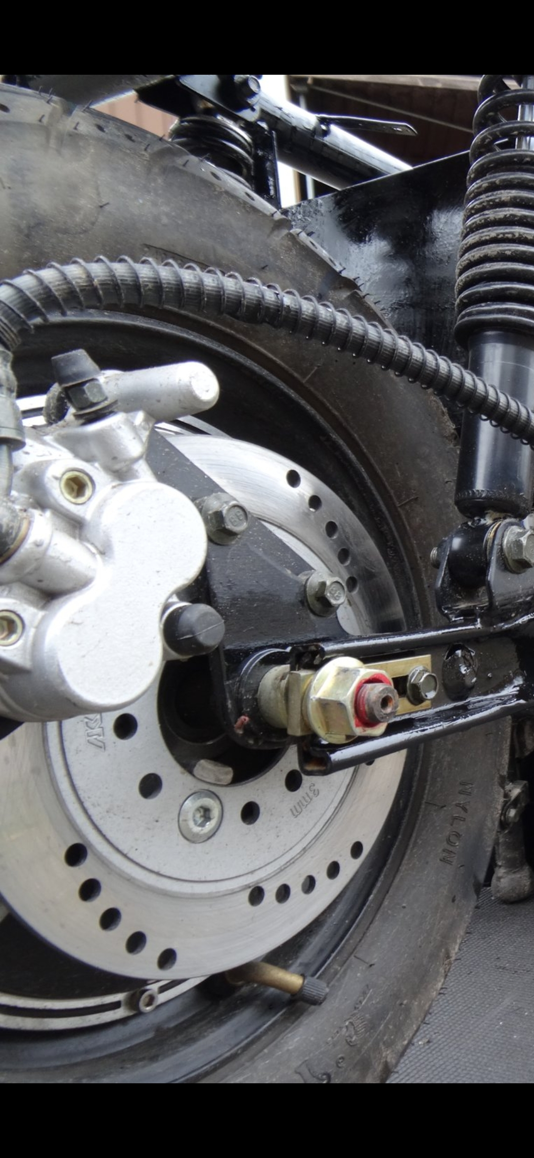 nachdem Du das erledigt hast, was mombi und andere empfohlen haben (Die Anti-Quietschpaste gehört natürlich auf die metallene Rückseite des Bremsbelages) könntest Du beim Wiedereinschieben der Gleitbolzen des Schwimmsattels in deren Führungsrohre kontrollieren, ob die Gummi-Manschetten richtig sitzen. Im eingebauten Zustand (mit Rad drin) sollte bei leicht angezogener Bremse dann genug "Luft" zwischen der (schwarzen) Montageplatte bzw. der Kontermutter auf dieser Montageplatte und diesen Gummi-Manschetten sein. Ist da kein Spielraum mehr, könnte bei "Bremse los" dann dort Druck ausgeübt werden, so dass der Belag der Fest-Seite ständig an der Bremsscheibe schleift. Fehlt diese "Luft" legen die Chinesen gerne Passscheiben unter (innen zwischen Gabel-Loch und Bremsträgerplatte), also in die Verschraubung der beiden (großen) Bremssattel-Montageschrauben. Wäre zumindest eine Möglichkeit.