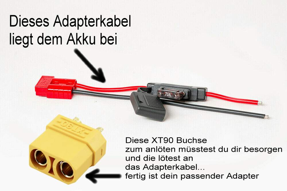du musst eigentlich dir nur eine xt90 buchse zum anlöten extra irgendwo besorgen. im akkupack liegt ein adapterlabel bei an dem man etwas anlöten kann. am freien ende des adapterkabel´s musst du dann nur die xt90 buchse anlöten. dann kannst du den akku an deinen scooter stecken ohne probleme. nur eine buchse anlöten fertig ist der passende adapter.