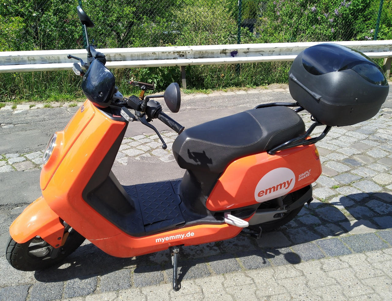 wir Berliner kennen emmy in erster Linie von den nostalgischen Govecs-Schwalbe-Rollern, die dieser Sharing-Dienst in typischen emmy-Rot in die Straßen sendet. Neuerdings scheint es auch Nqi im Verleih zu geben, das ist mir schon vor ein paar Tagen aufgefallen. Vermutlich Nqi Sport mit 45 km/h jedenfalls. Hier ein paar Fotos eines in freier Wildbahn gesichteten Exemplars.