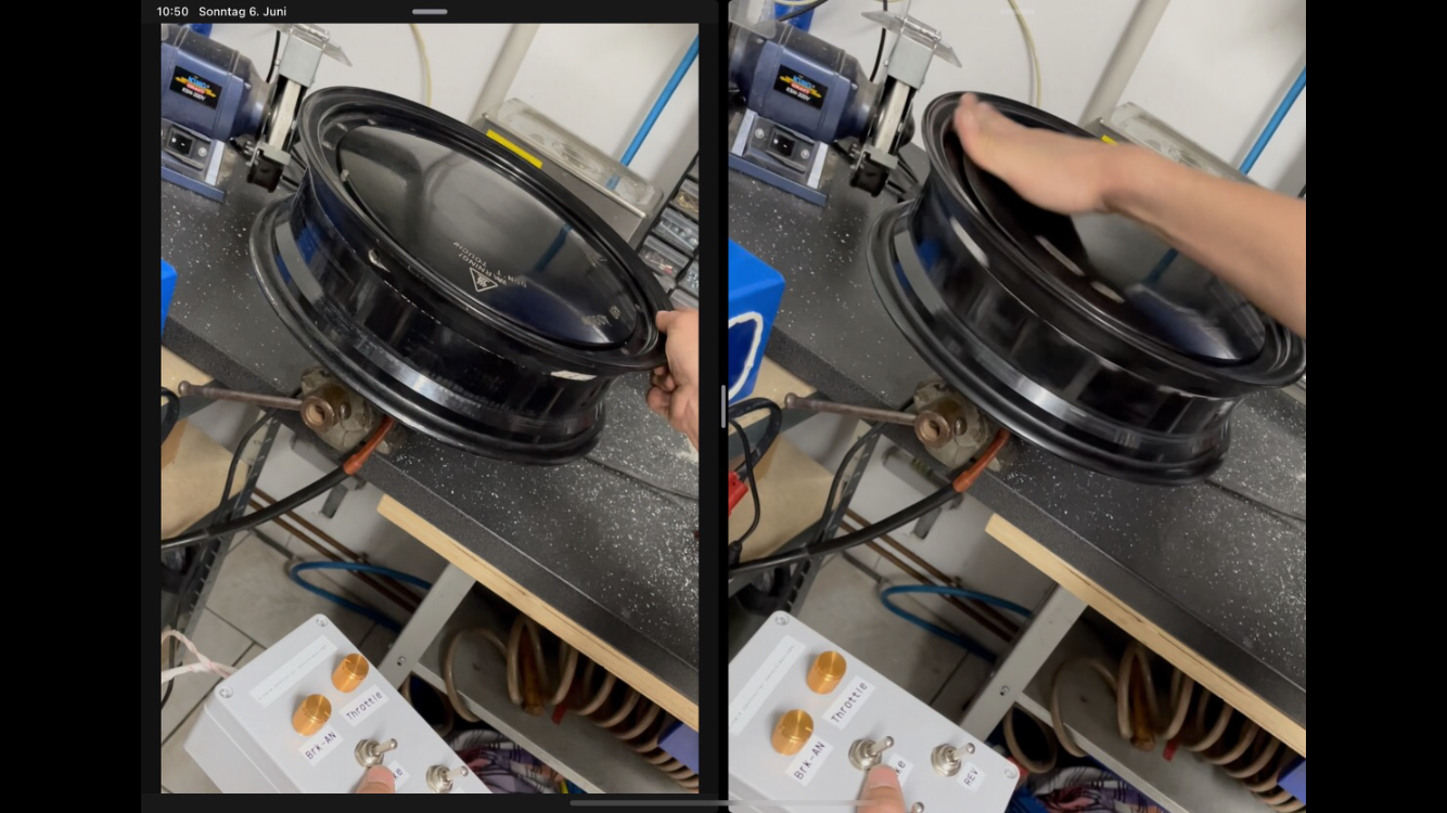 Der Motor lässt sich frei von Hand drehen bis etwas Gas gegeben wird (Im Bild rechts). Dann fängt er an zu brummen und lässt sich nicht mehr drehen. (Links)