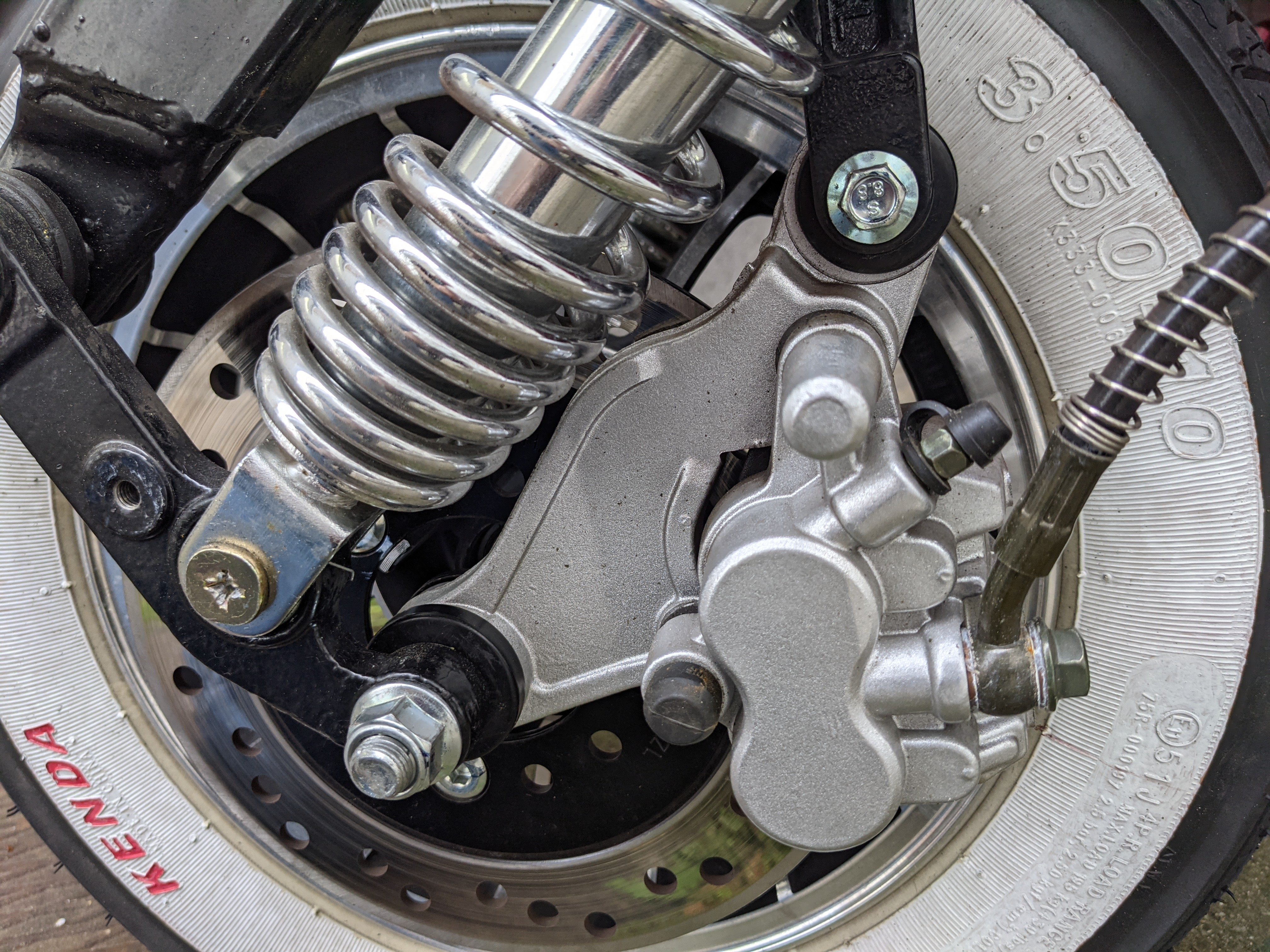 die aber (dummerweise) wegen der Radaufhängung verkehrt herum eingebaut ist und erst abmontiert werden muss, um an die (jetzt innen liegenden) Bolzenschrauben zu kommen, die die Beläge festhalten.