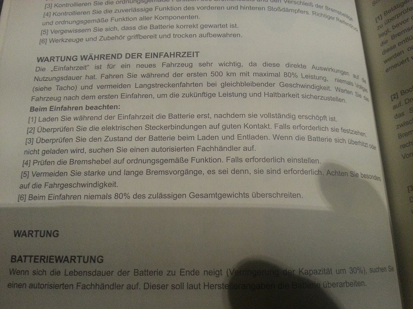 Okay, das mit den Kistenschiebern klingt logisch obwohl die Anleitung an sich schlüssig und recht umfangreich ist. Sogar ein Schaltplan (leider ohne nähere Bezeichnung des Controllers) und eine Liste, mit Sachen die bei den jeweiligen Inspektionen zu tun sind, ist in dem Heft enthalten. Die Übersetzung ins Deutsche ist, im Verhältnis was man sonst so bei China Produkten hat, auch recht gut.