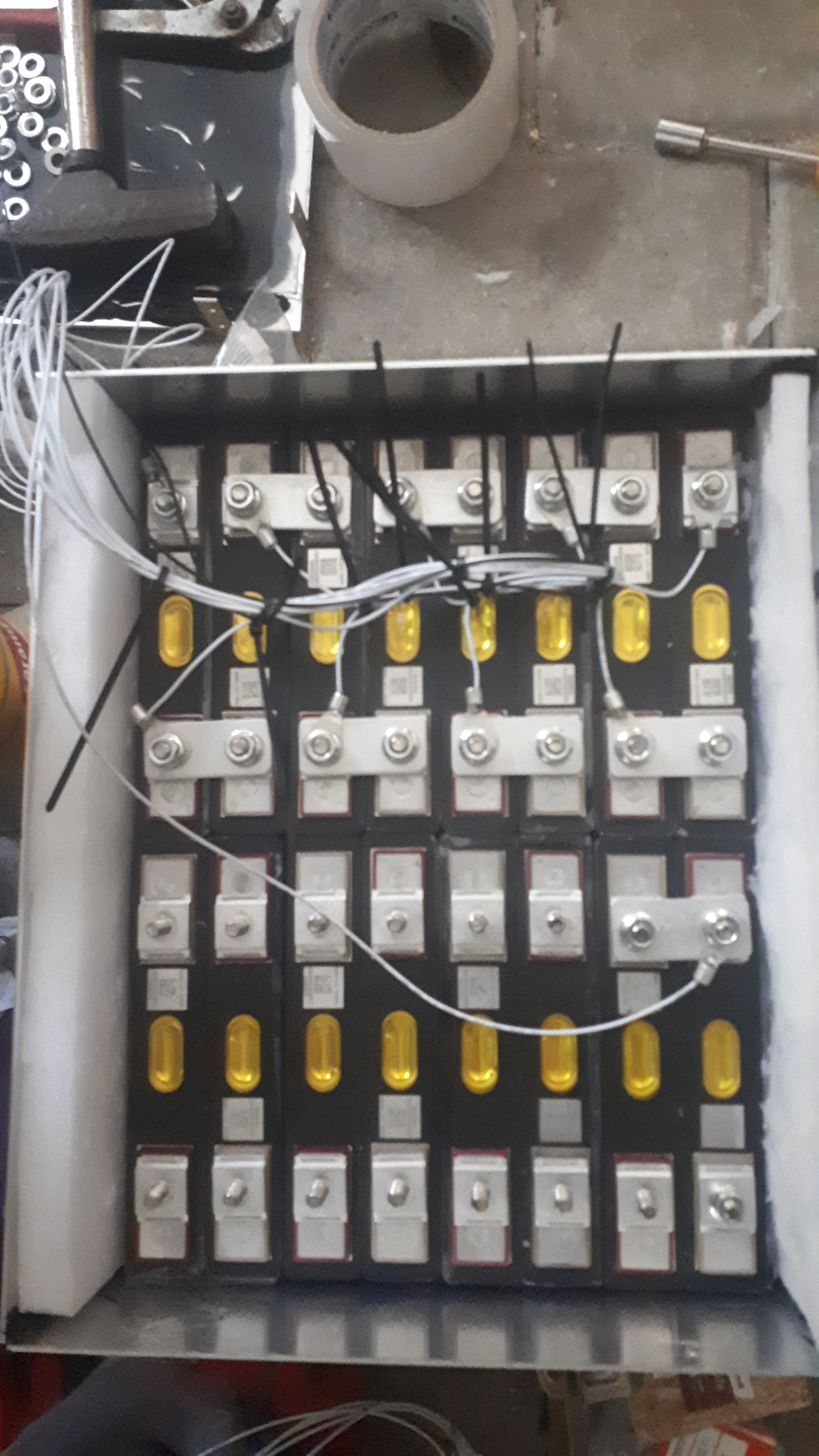 Die Zellen werden dann als 2 8ter Blöcke verbunden und Boden an Boden im Kasten liegen (außen rechts und links dann die Pole im Kasten), BMS in den Kasten oder lieber von außen?
