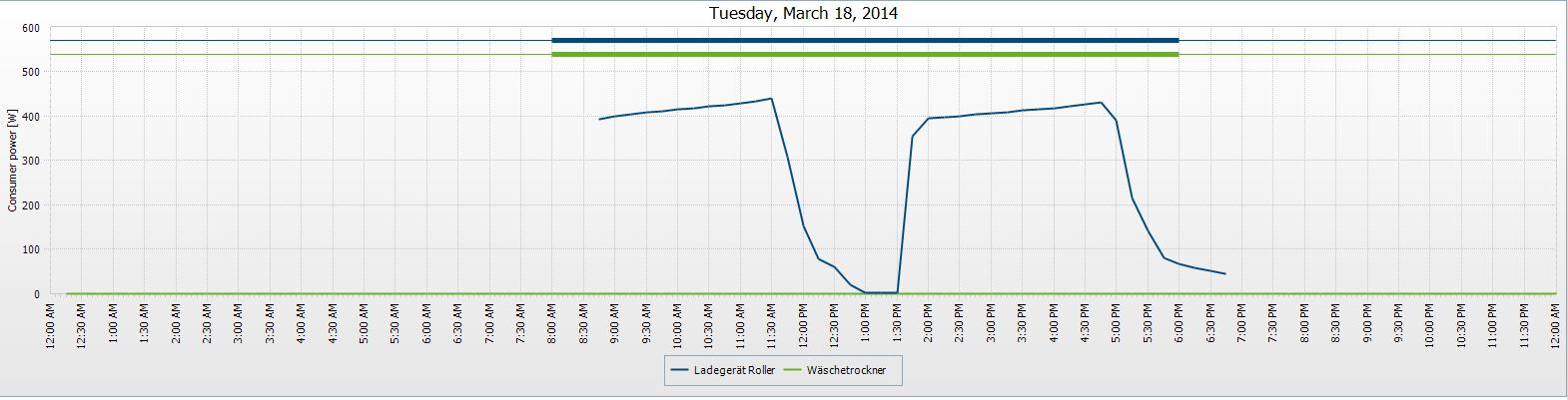 Wenn ich mir das Bildchen jetzt ansehe sehe ich, dass nach 3h die vom Ladegerät abgerufene Leistung nachlässt und dann nur noch wenig geladen wird. Das Ladegerät selbst zeigt mir aber via einer grünen LED an, dass der Ladevorgang beendet ist.