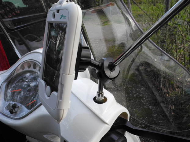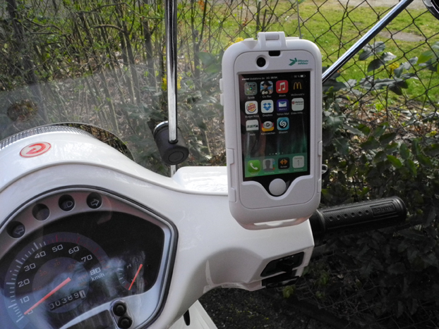 Ich habe nun eine iPhone-Halterung gefunden, welche wasserdicht ist, sich das iPhone noch in der Halterung bedienen lässt, einfach abnehmbar, aber dennoch stabil verriegelt ist und optisch auch noch zu meinem weissen Roller passt (gibt es aber auch in schwarz).