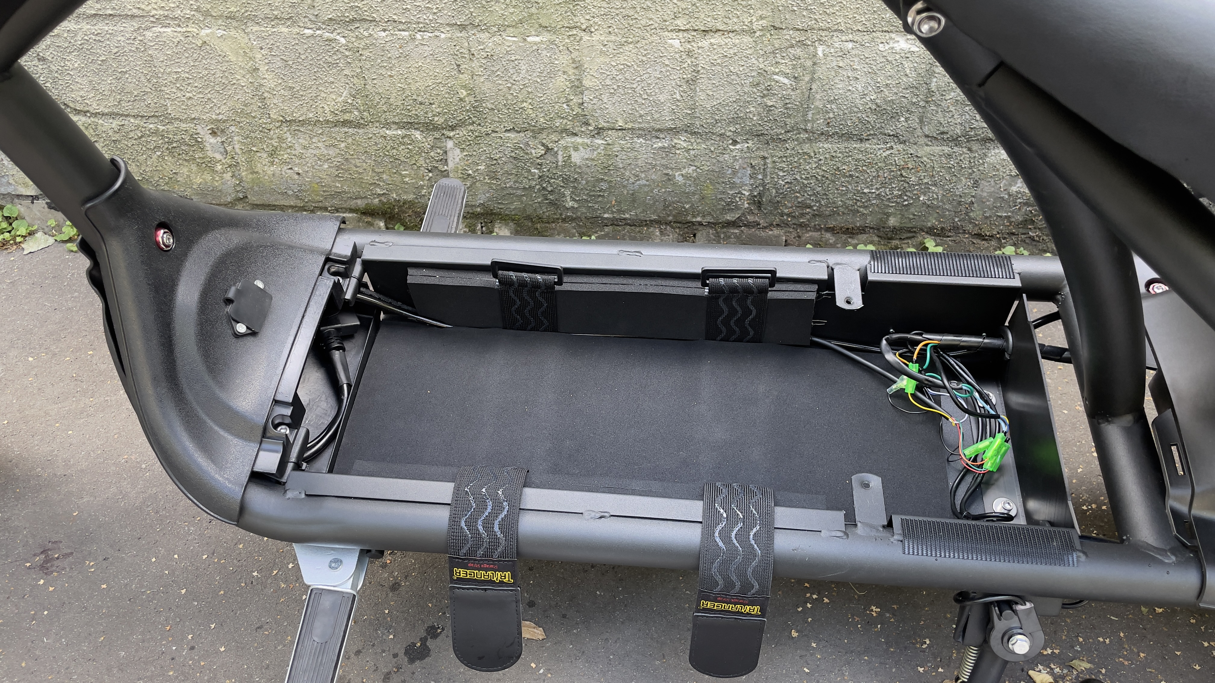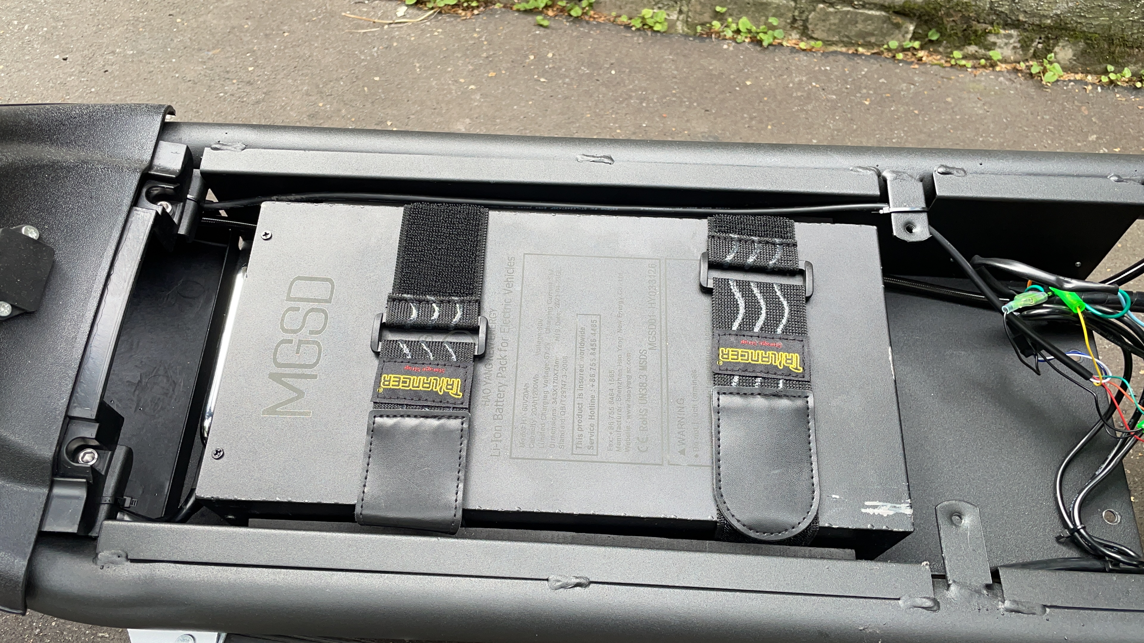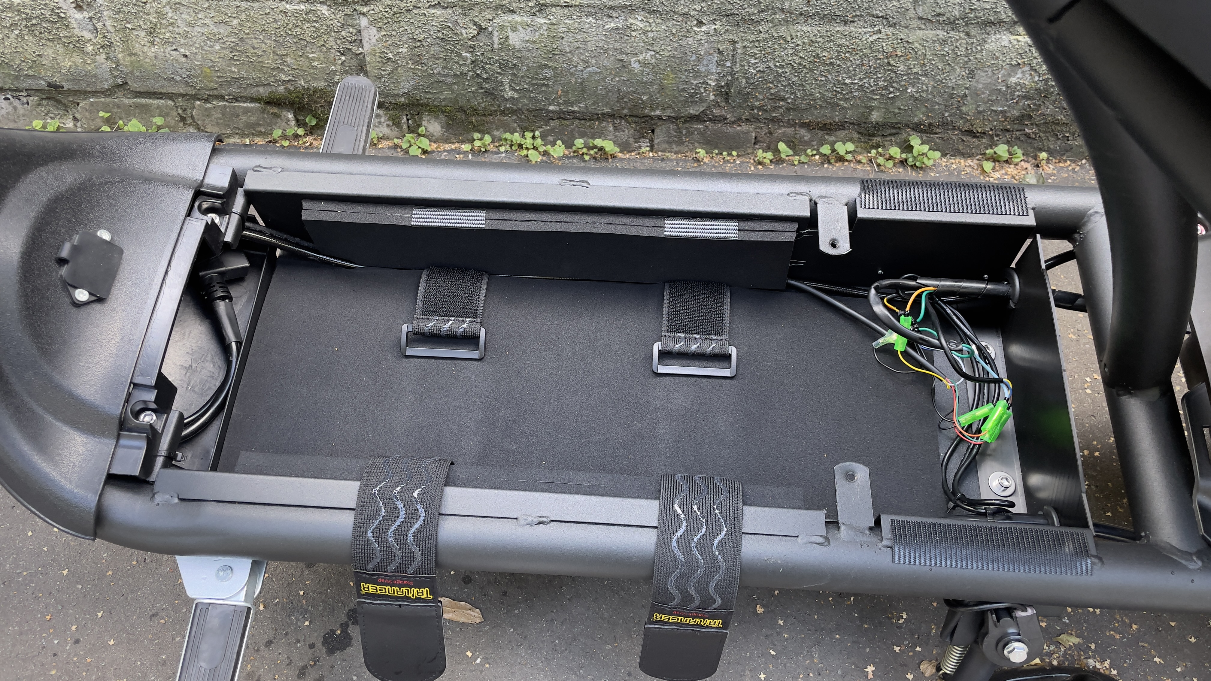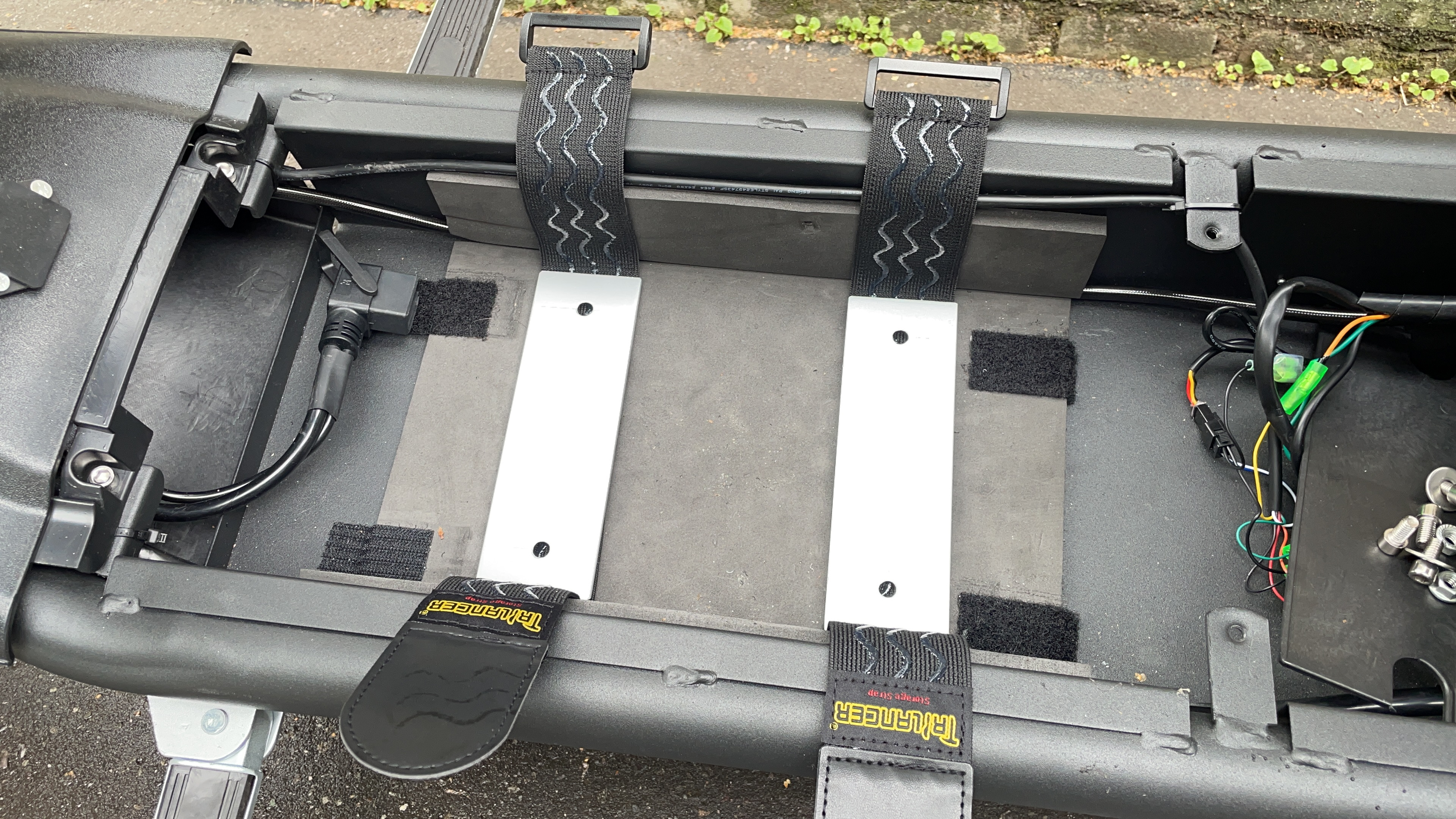 Hintergrund ist folgender, wenn der Akku serienmäßig mit den Klettpads aufgeklebt wird auf die Gummimatte, schützt das zwar den Akkudeckel (im Speziellen das Schloss) vor dem verbiegen, weil der Akku ja bei jedem Hüppel nach oben raus fliegen möchte, aber da wir ja kaum Federung haben glaube ich das das auf Dauer dem Akku nicht gut tut wenn der permanent "Schläge" bekommt. Ich denke bei meiner Variante sollte das minimiert sein.