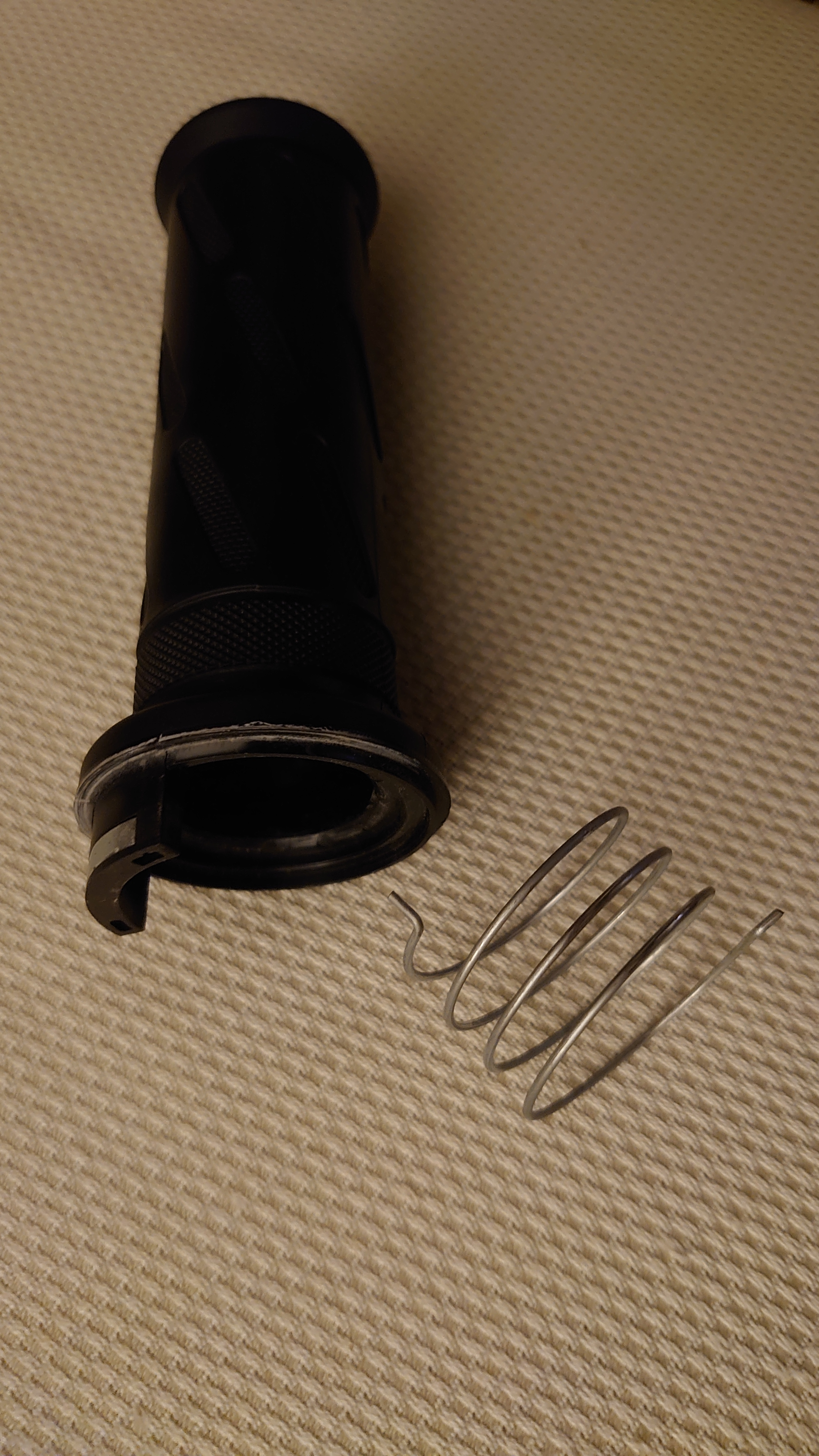 Ich habe in den letzten Tagen versucht, mit losem Griff weiterzufahren. Feder im Griff einrasten, alles draufschieben, Feder am Lenker einrasten, und dann - während leichter Kraft axial zur Fahrzeugmitte - so lange Richtung Gasgeben drehen, bis der Vorsprung in die Nut springt. Klappt einwandfrei (funktionell zumindest), allerdings muss man sehr konzentriert fahren, weil man den Griff die ganze Zeit Richtung Fahrzeugmitte drücken muss, damit man nicht wieder alles verliert. (Als absurden Diebstahlschutz hab ich den Griff samt Feder beim Abstellen immer abgenommen.)
