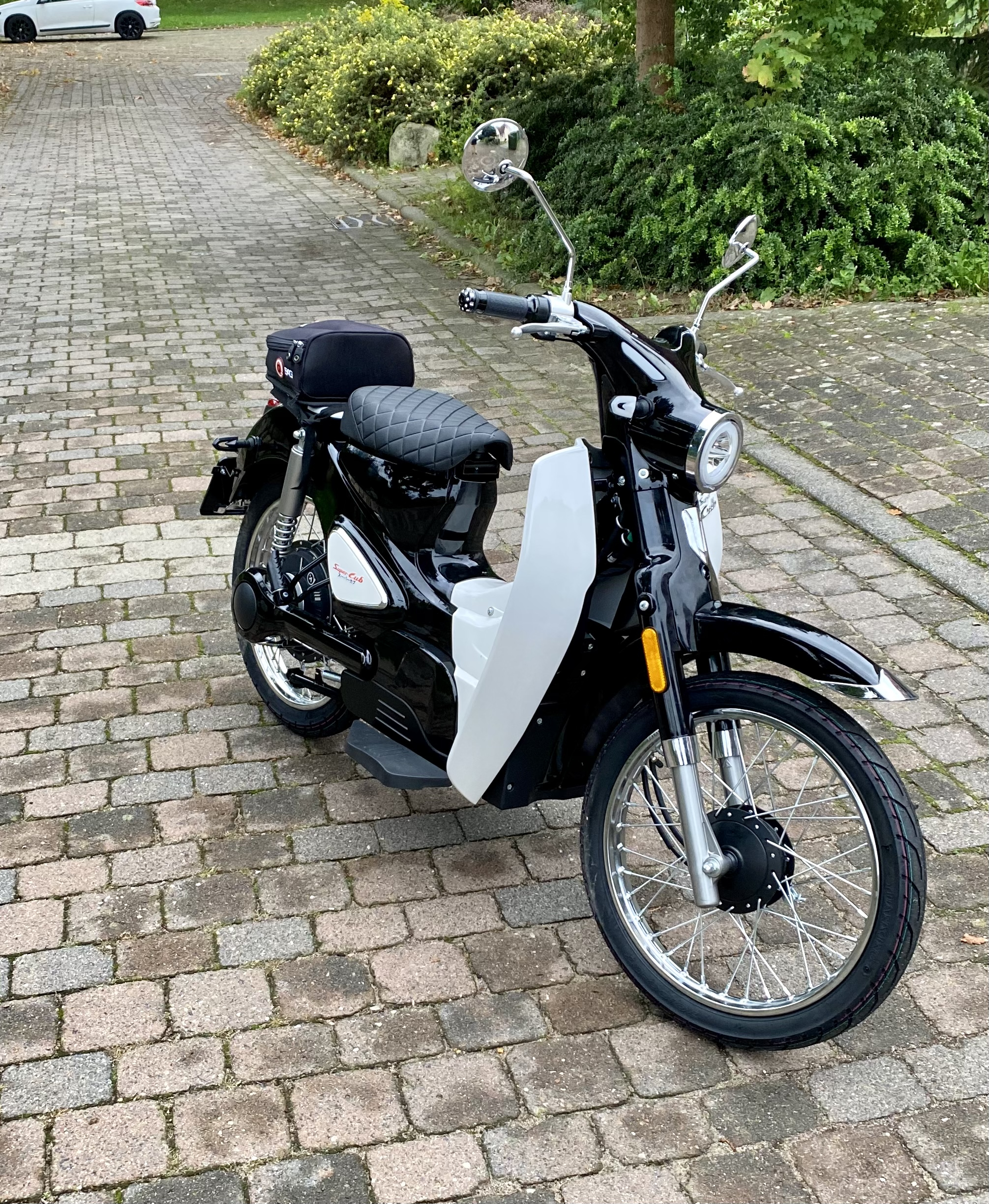 Das Fahren macht total Spass, völlig lautlos, überraschend starker Anzug. Das Fahrzeug ist ungefähr baugleich mit der Honda C50, ein Verbrenner-Klassiker, der seit 1958 100 Millionen mal gebaut wurde.
