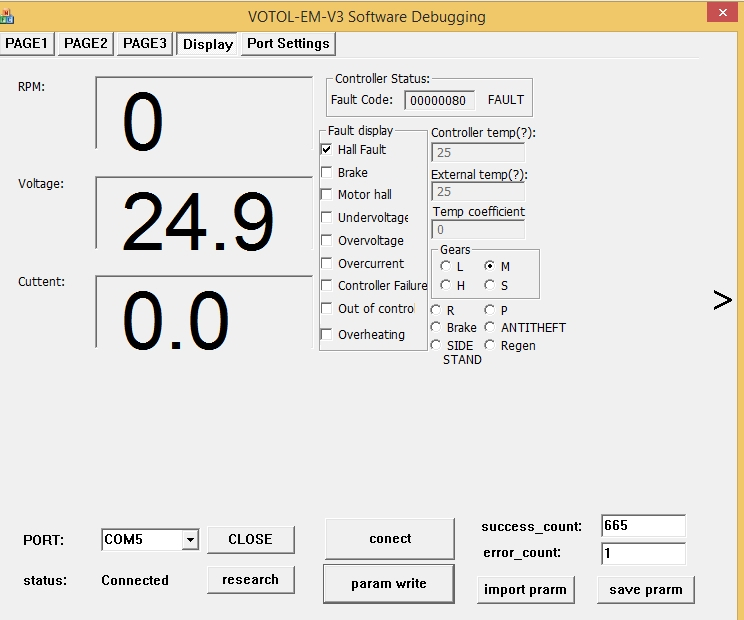 mein proplem ist das drei controller sobald man sie an den computer hängt den Faultcode 00080 und Hall Fault (siehe bild 1) anzeigen. Die Hall sensoren sind es aber nicht, die Software zeigt drehzahl und strom einwandfrei an. wenn man einen hallfehler produziert zeigt er bei jedem einzelnem Hallsensor einen anderen fehler (daS IST ALSO CORRECT).