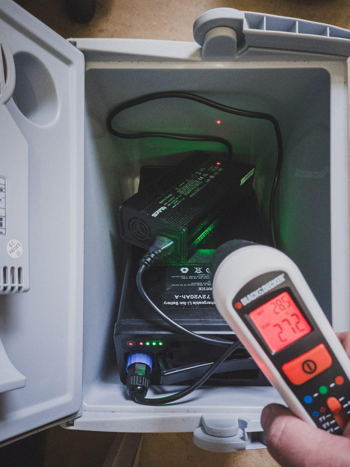 Und die ist ordentlich, bei 33Grad etwa, platziere ich das Ladegerät vorsichtshalber wieder aus der der Box hinaus. Wahrscheinlich würde auch bei mehr Temperatur nix schlimmes passieren. Aber ich bin da vorsichtig, wenn ich das so lade, dann nur unter Kontrolle. Das ist aber auch das einzig aufwendige.