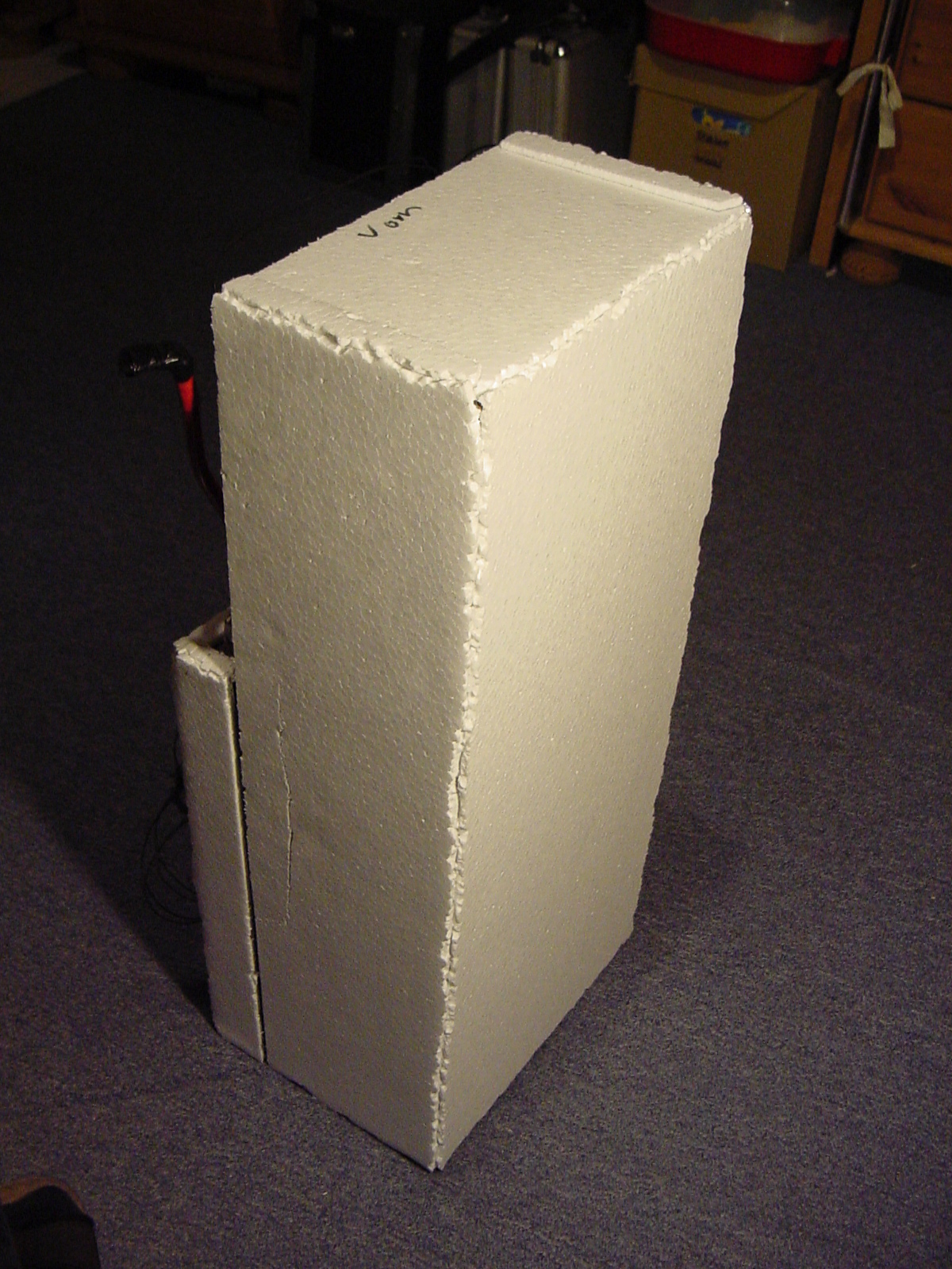 Leider kann ich zur Zeit nicht Oberflächentemperaturen messen, aber beim letzten Testlauf waren die beheizten Seitenflächen außen nur noch noch marginal wärmer als der kalte Tisch darunter, dank zweiter 5mm Styropor Isolierschicht und der Riffelblechfolie außen rum.