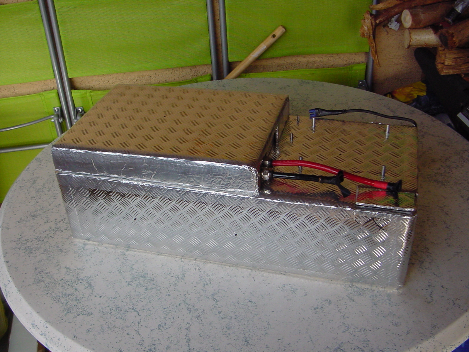 Heute habe ich den Modellbau-Hochstromstecker an die vier Heizmatten konfektioniert, und schon vor einigen Wochen die Riffelbech-Optik per d-c-fix Folie aufgebracht. Jetzt sieht das heizbare Schmuckkästchen so aus: