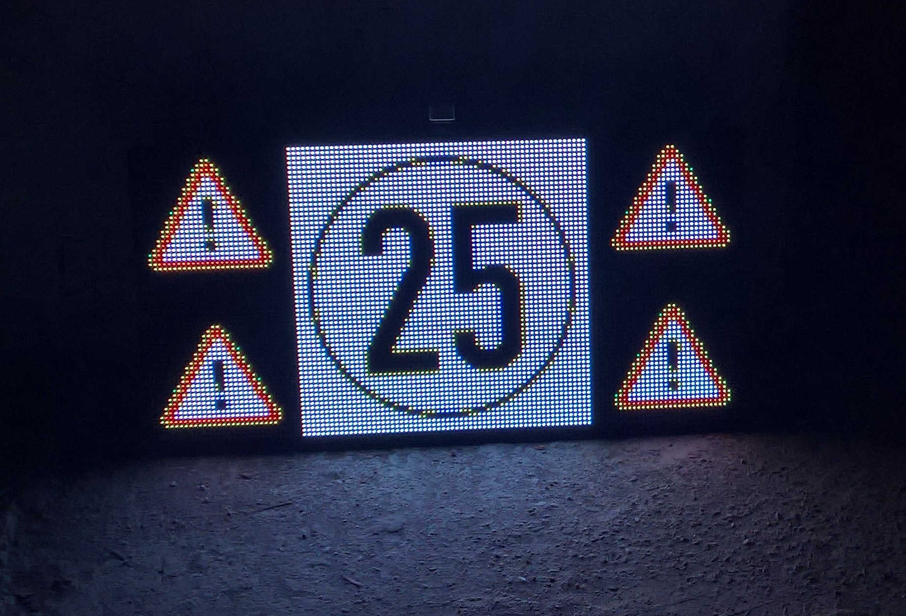 Das Display habe ich so programmiert, dass es alle 10 Sekunden abwechselnd das 25er-Schild und die Warntafel anzeigt (sie ist in echt orange, nicht weiß - liegt an der Kamera):