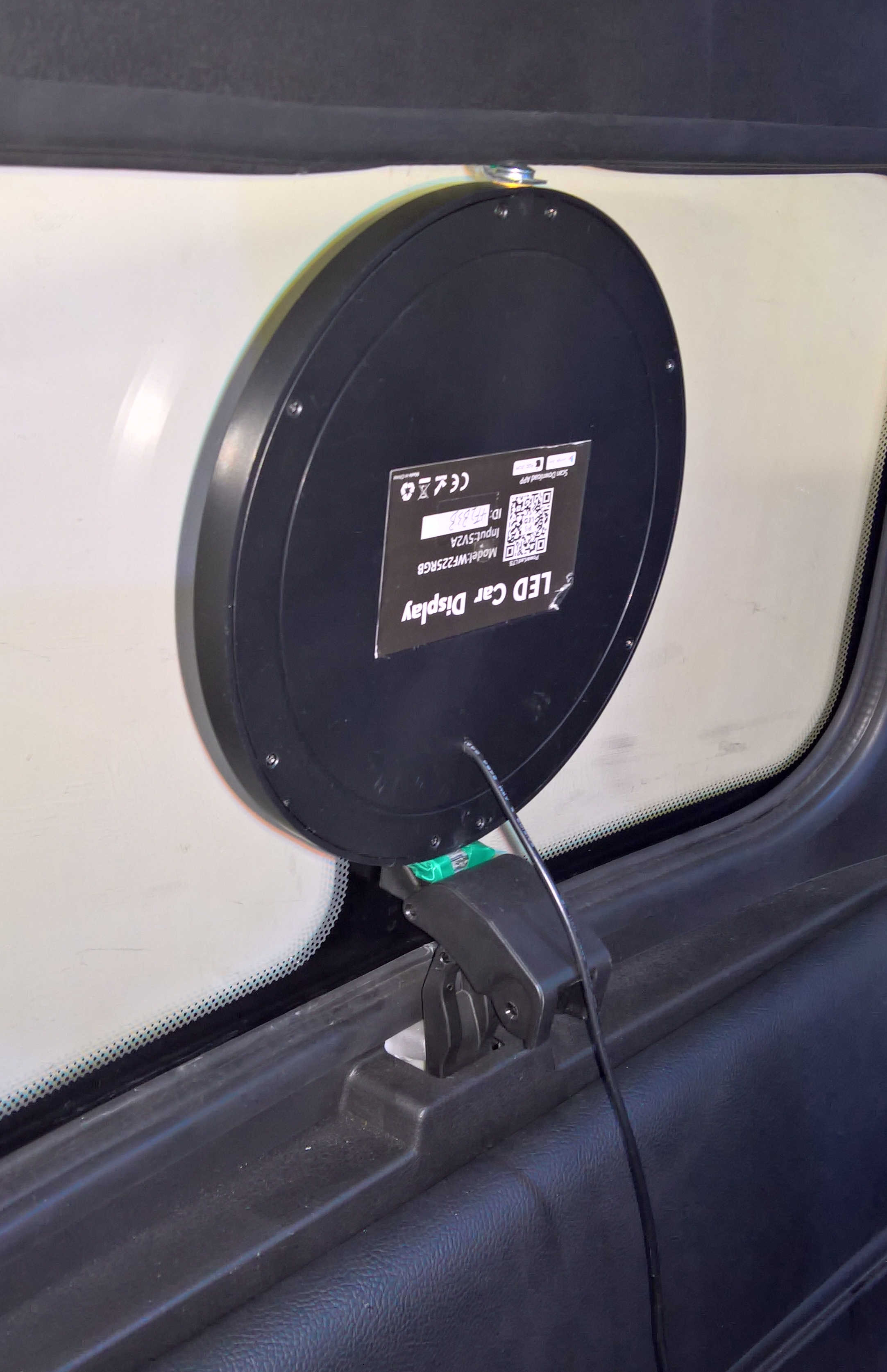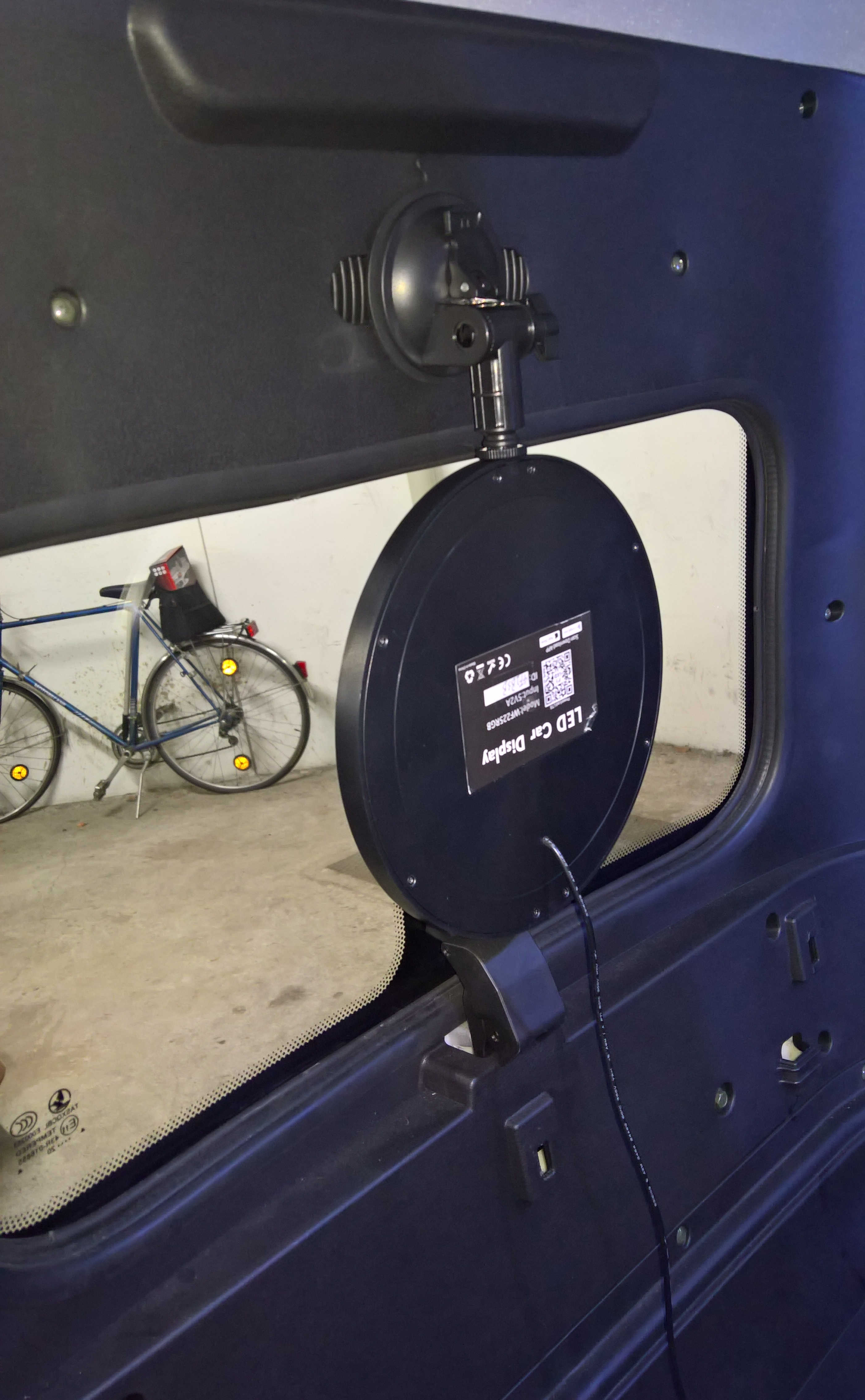 Irgendwann war das runde Display da. Im Vergleich zum rechteckigen ist es deutlich leichter. Eine Halterung mit Saugnapf ist im Lieferumfang. Leider haftet sie nicht auf der Innenverkleidung des Kabinenrollers. Gar nicht. Auf der Heckscheibe sitzt sie bombenfest, aber die Heckscheibe ist dafür zu schmal. Und ich wollte eine Lösung, mit der die Heckscheibe komplett frei ist, wenn man das Display nicht benötigt.