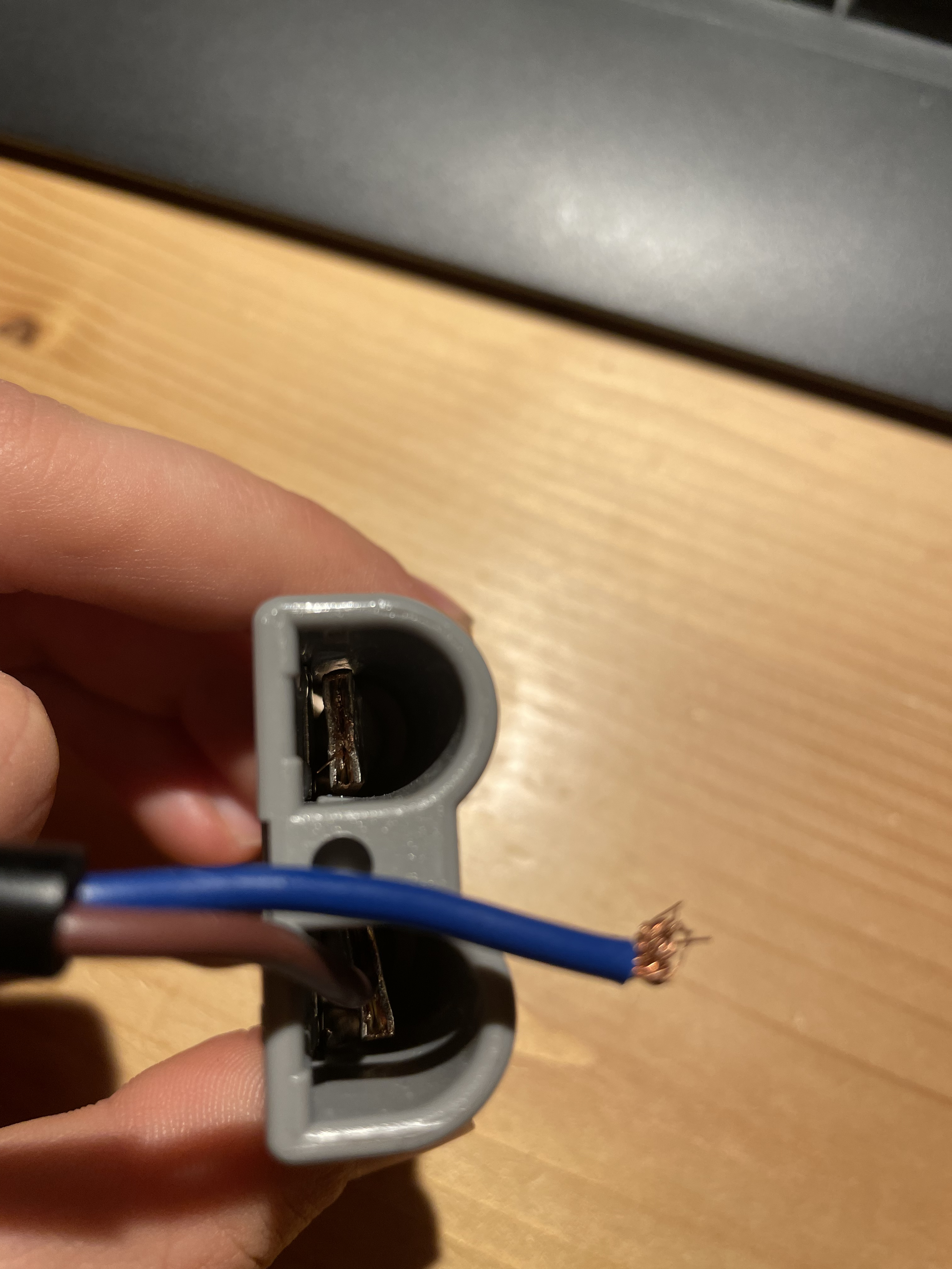 Ich habe mir das Foto nochmal angeschaut. Offensichtlich sind die Kontakte nicht ordentlich konfektioniert worden. Die Kontakte gibt es ja einzeln zu kaufen. Beim Zusammenbau schnappen sie im Gehäuse (Federkontakt im Innern) ein. Ein entriegeln des alten Kontakts ist vielleicht nicht einfach. Der Kabelquerschnitt ist wohl 2,5mm². Ich faltete das neuabgesetzte Kabel einmal.