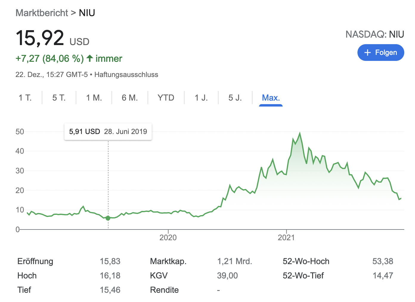 Ich meine, das ist vermutlich ein guter Einstiegskurs - wenn die ihr Geschäft wieder auf die Reihe bekommen. Keine Ahnung, warum die im letzten halben Jahr so abgestraft wurden. Bin nicht so sehr der Chart-Analytiker, sondern vertraue eher auf die fundamentalen Werte von Niu (Marktposition, in Verbindung mit dem eigentlich vorhandenen Enthusiasmus für Elektro-Mobilität)