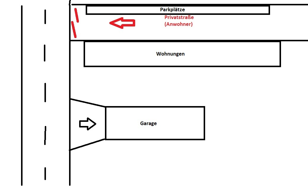 Da die Querstrasse keinen Gehweg hat, fährst du hinein, biegst links ab und dann gleich wieder links in deine Garage,