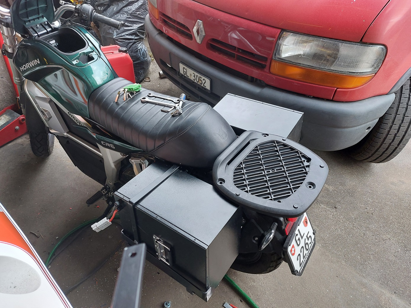 Sieht etwas gross aus, so auf den ersten Blick. Werde aber hinten noch ein Topcase montieren,dann stimmen die Proportionen besser.Und Leder noch spannen. Zusätzliches Gewicht total beidseitig liegt am Ende bei ca 52 Kg.