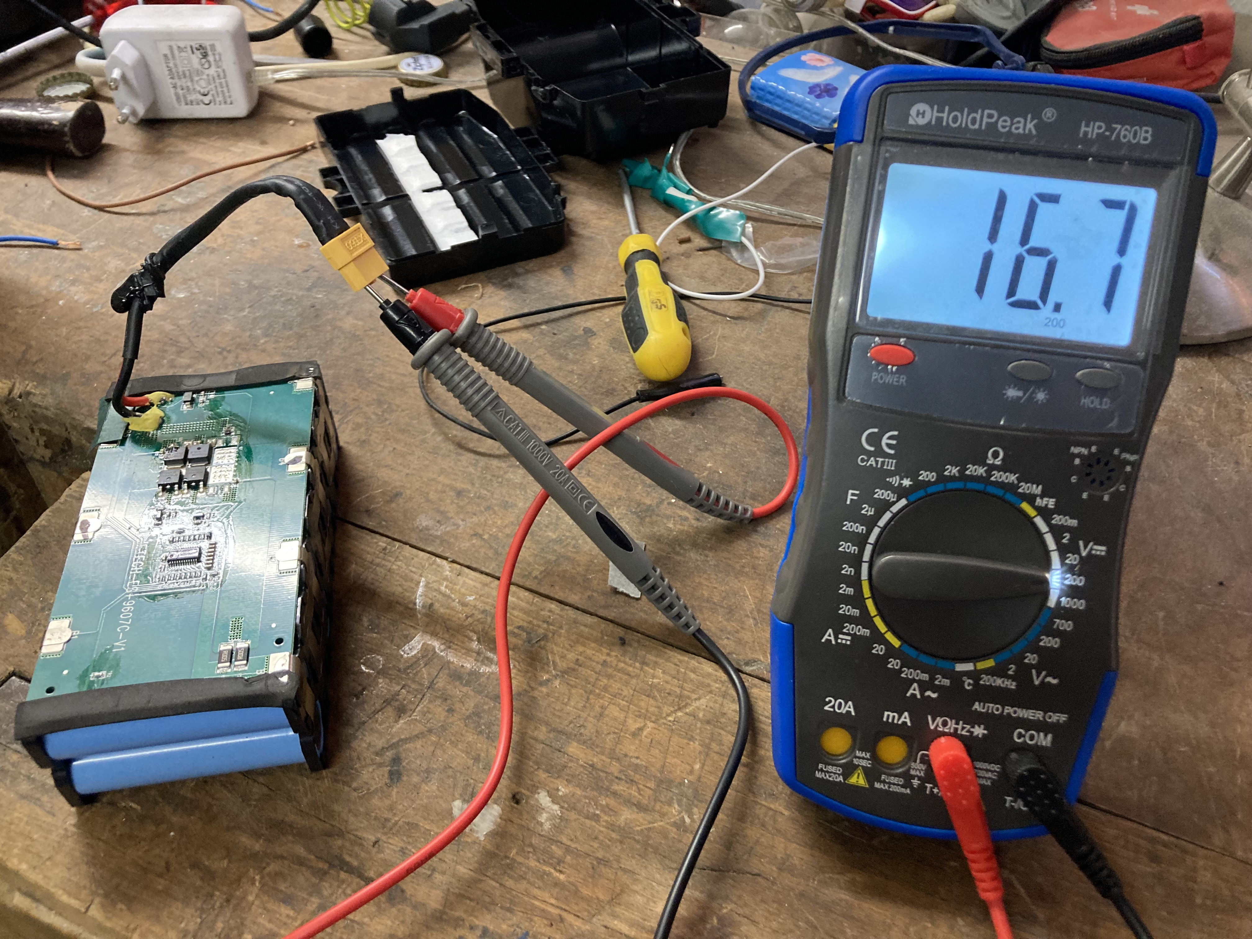 Bei einem 24V Li-Ion akku sind 7 Zellen in Reihe verbaut, Wenn der Akku jetzt nur noch 16V hat, dann ist entweder mindestens eine Zelle komplett tot (0V) und die anderen bei 2,6V, was auch schon sehr hart an der Grenze ist, oder alle Zellen haben eine Spannung von 2,3V was echt nicht mehr schön ist. Selbst wenn du den Akku wieder zum laufen bekommst, das BMS sollte sowas eigentlich unterbinden. Ich kann dir nur empfehlen, den Akku auszutauschen, um mögliche Volgeschäden zu vermeiden. Vor allem würde ich einen Akku ohne nachweislich funktionierendes BMS nicht über Nacht laden lassen, eine Überspannung der Zellen nehmen Li-Ion akkus einem sehr übel.