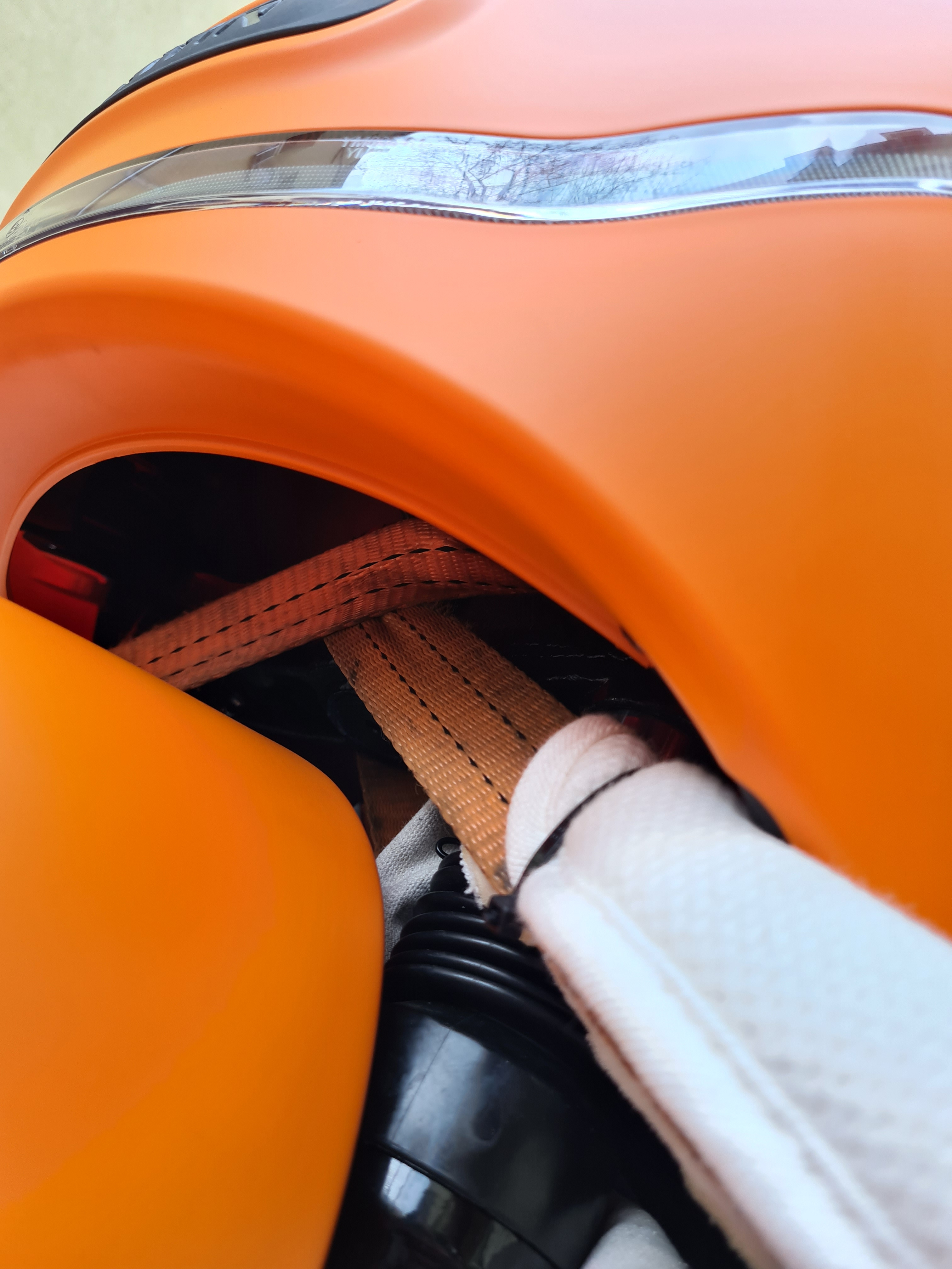 Vorn war ich mir sehr unsicher. Dann habe ich aber Fotos im Internet gefunden, auf denen man sah, dass man an die Gabelbrücke trotz Verkleidung vermutlich gut rankommt. Und das hat tatsächlich super geklappt (siehe Fotos). Es ist eng und bisl fummelig, aber es geht. Auf der linken Seite muss man drauf achten, die Bremsleitung nicht zu verzurren, rechts ist irgendein Kabel, hinter dem man den Gurt langführen muss, um das Kabel nicht zu beschädigen. Wenn man darauf achtet, klappt das gut. Beim Verzurren dann ggf. noch mit Tüchern o.ä. etwaige Stellen der Verkleidung schützen. Das hat bei mit nur den hinteren Teil des Schutzbleches betroffen.