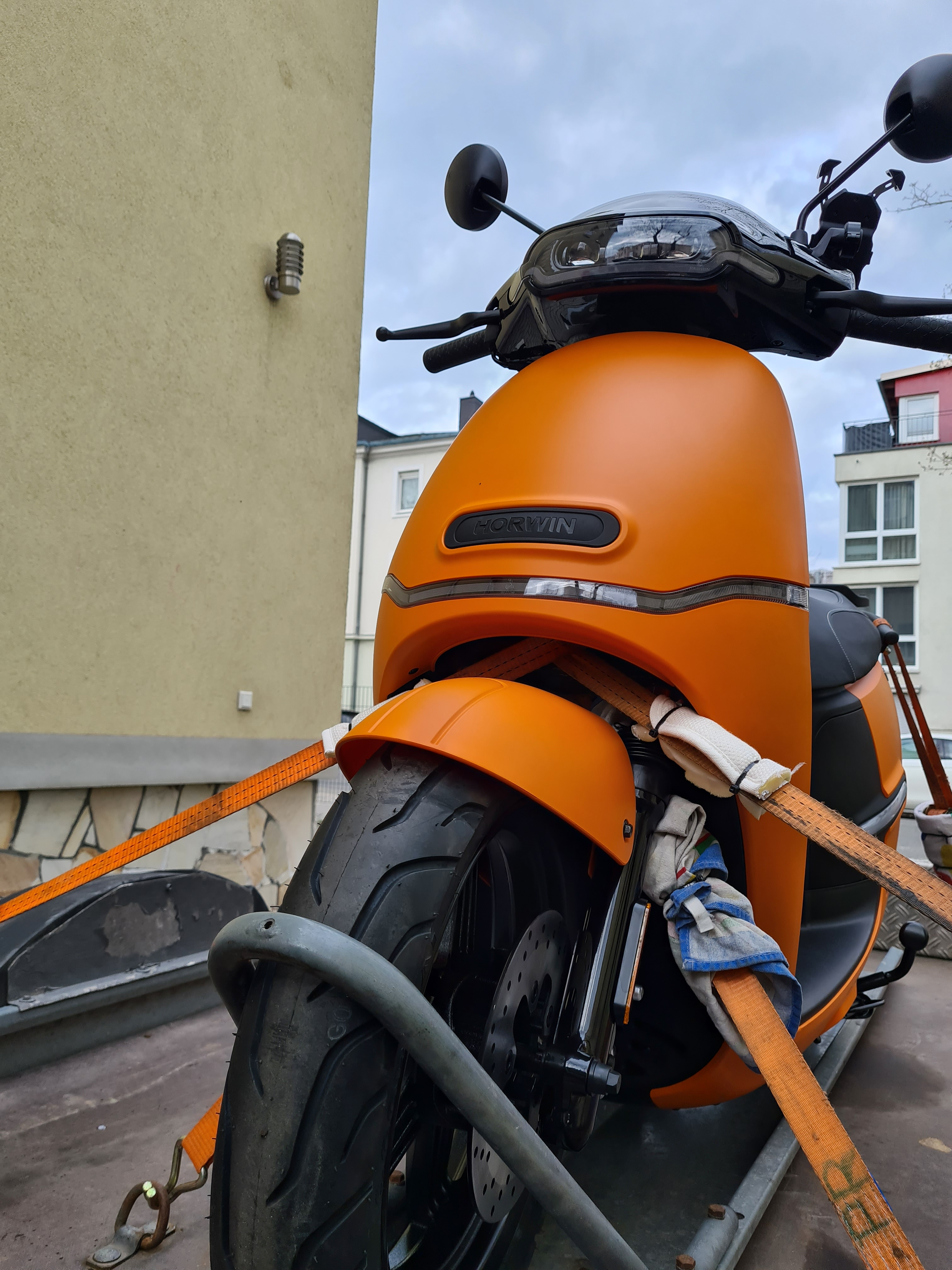 Dann die Gurte so verzurren, dass die Gabel ein ordentliches Stück einfedert. Mit 4 Gurten ist der Roller dann bombenfest. Am besten nach einigen km noch mal prüfen.