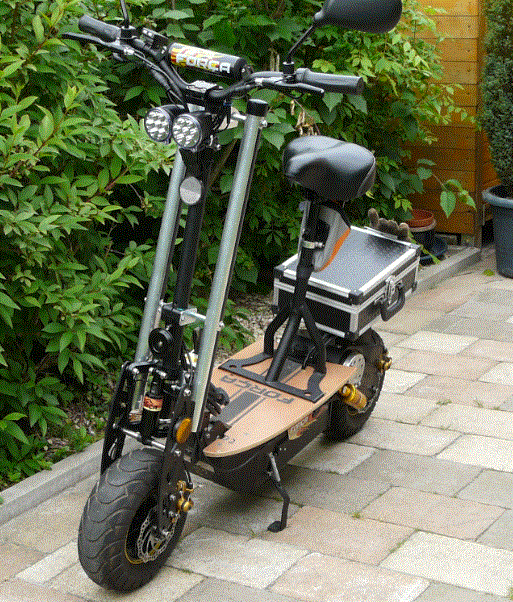 Meine beiden Alurohre sind reine Attrappen und habe keine echte Funktion. Es sind eine rein optische Verbesserung um einen robusteren Eindruck zu bekommen und um die Lenksäule etwas schräger erscheinen zu lassen, eben wie beim neuen Bossman. Damit sieht man auch wie man mit ein paar Alurohren aus dem Baumarkt und ein paar Rohrschellen den Scooter optisch verändern kann. Rein technisch gibt es überhaupt keine Veränderung am Scooter. Die Rohre sind an zwei Stellen nur mit der Lenksäule verbunden. Den Scheinwerfer hatte durch eine LED Version erstetzt, diesen habe ich ganz nach oben verschoben und durch eine zweiten daneben ergänzt. Den zweiten habe ich aber nicht angeschlossen, kann man natürlich noch machen.