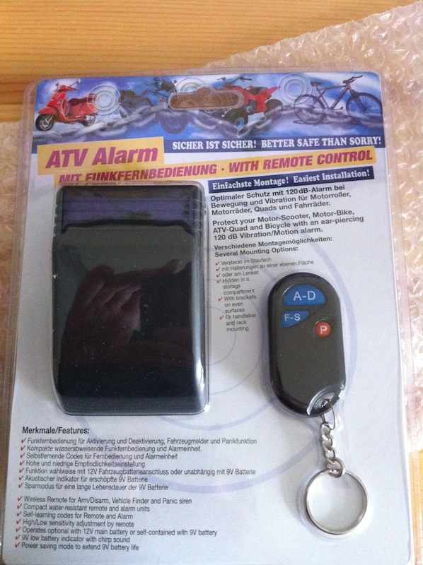 Nachdem das gute Stück nun über 450KM seinen Dienst verrichtet hat und super läuft, geht es an die erste Bastelarbeit: Eine Alarmanlage soll rein. Da der Roller nah an der Straße parkt, und hier ab und zu schräge Gestalten herumlaufen, verschafft mir das ein sichereres Gefühl ;)