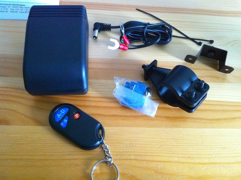 Dieser Kasten kann wahlweise auch mit einem 9V-Block betrieben werden, und kostet ca. 25,-€ Da ich sowieso die Wegfahrsperre nicht anschließen wollte, tut es auch eine AA mit einfacher Bewegungssensorik.