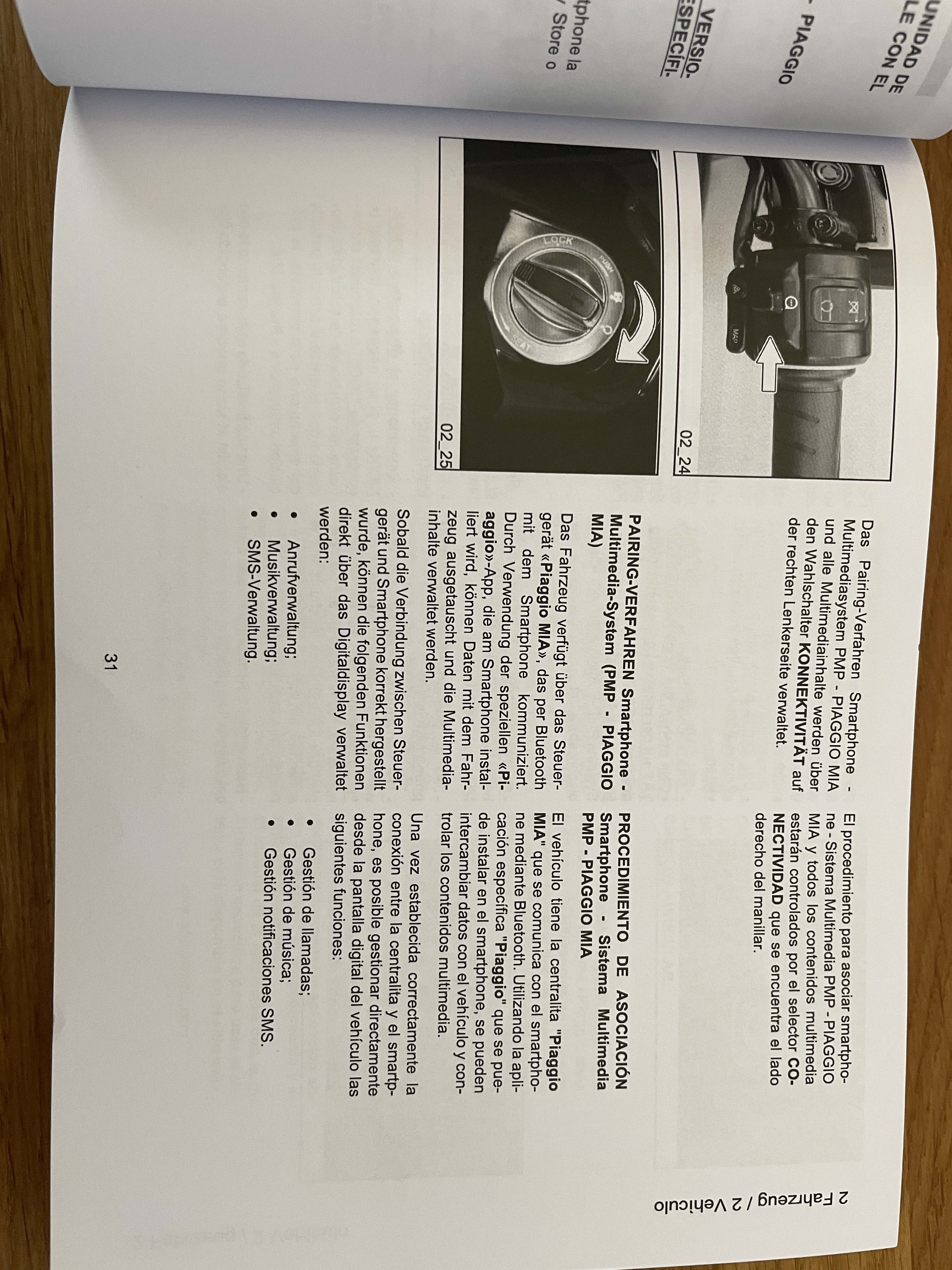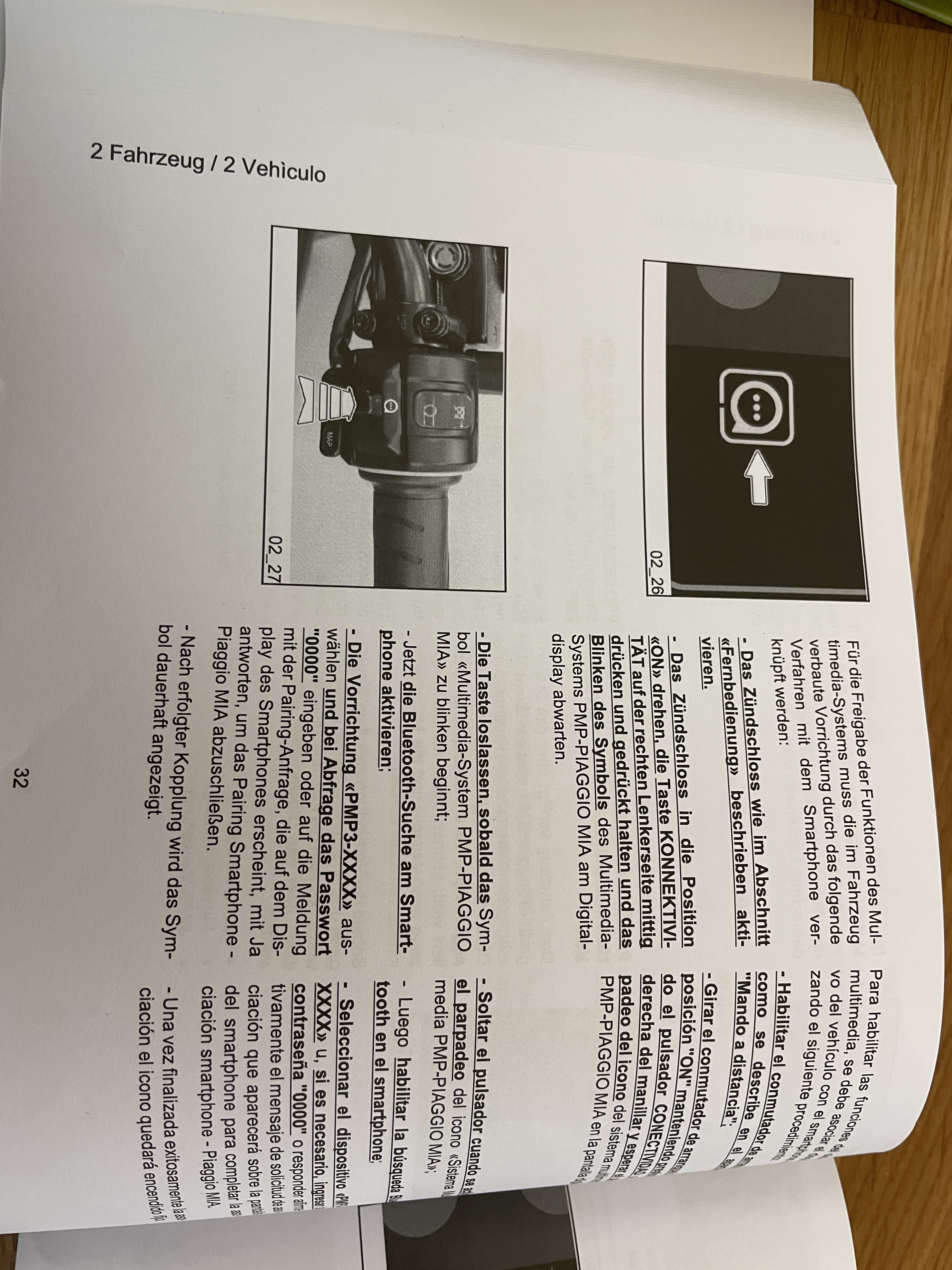 "Das Fahrzeug verfügt über das Steuergerät <<Piaggio MIA>>, das per Bluetooth mit dem Fahrzeug kommuniziert." (S.31)