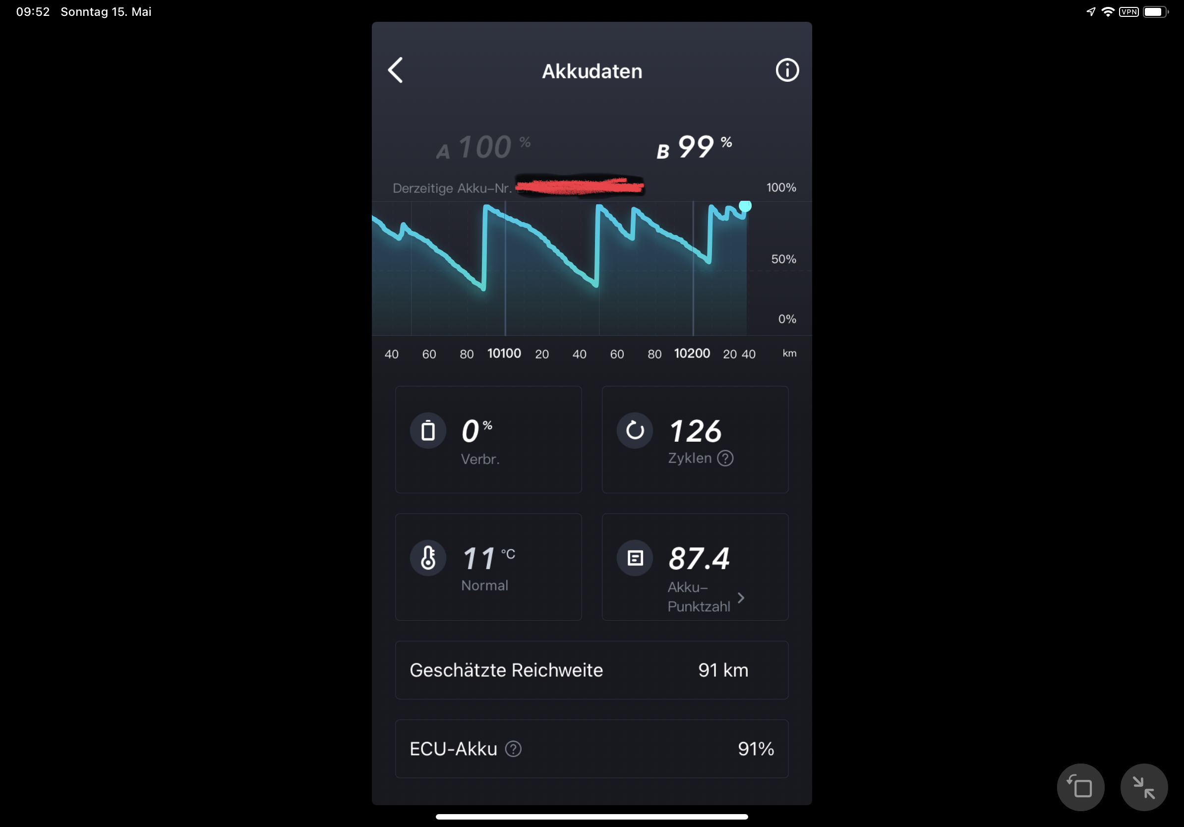 91 km Reichweite hat er mir noch nie angezeigt, wobei man der App eh kein Glauben schenken kann. Bei mir werden 60 km angezeigt wenn der Akku voll ist..Bussen hat geschrieben: So 15. Mai 2022, 09:56 1081D6A1-64F2-4938-87BA-674E900D0B92.jpeg