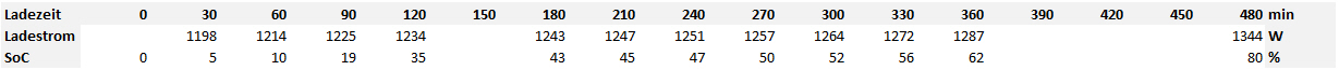 - Ich überschlage die Ladezeit immer mit enfachem Dreisatz: 100% = 10 Std; 10% = 1 Std; von 20 auf 80% = 60% = 6 Std)