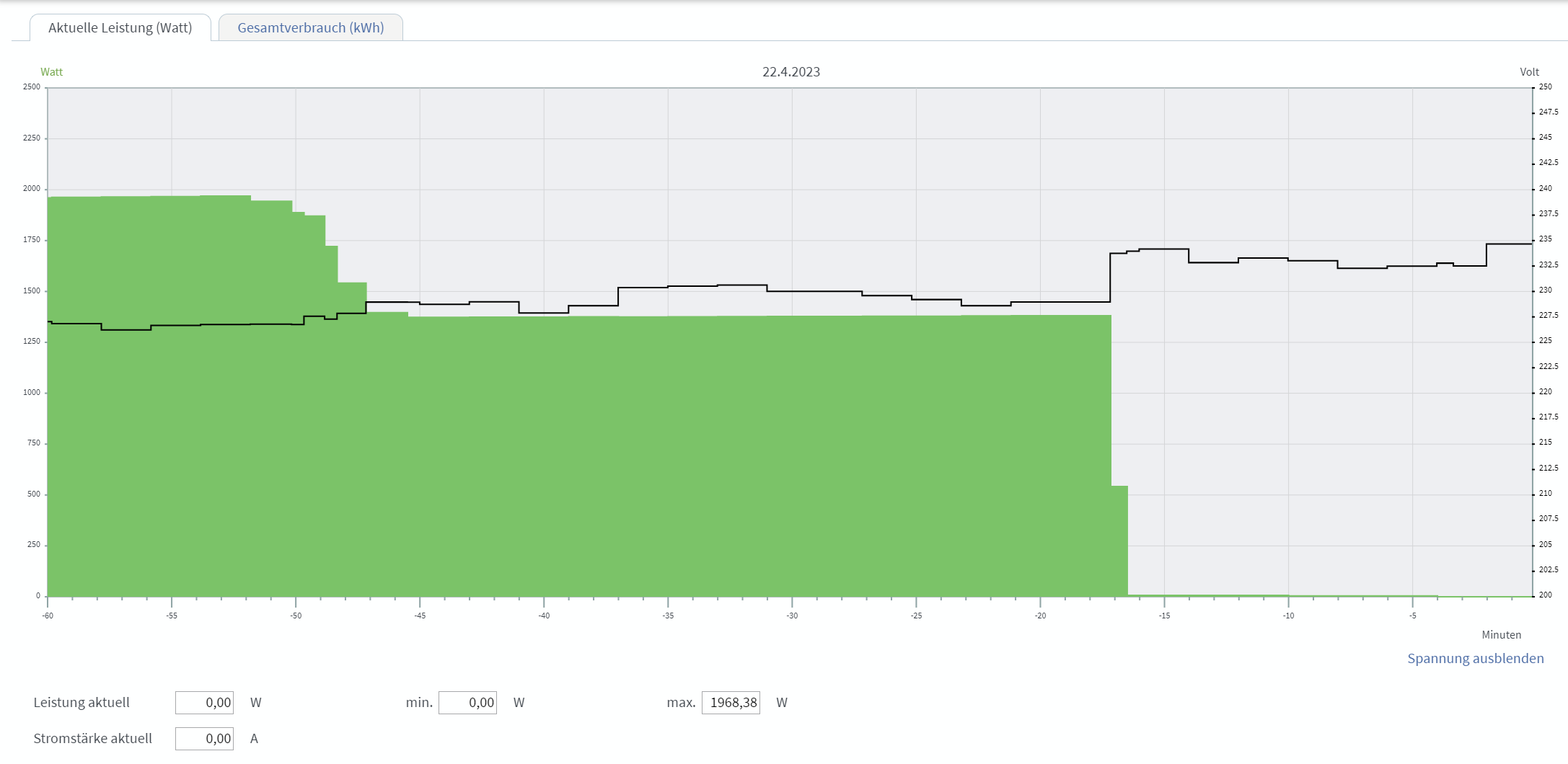 Schukokabel laut Alrendo-Display 12A, laut Energiezähler ca. 1,6-1,8KW, ab ca. 90% dann stark abfallend bis 100%.