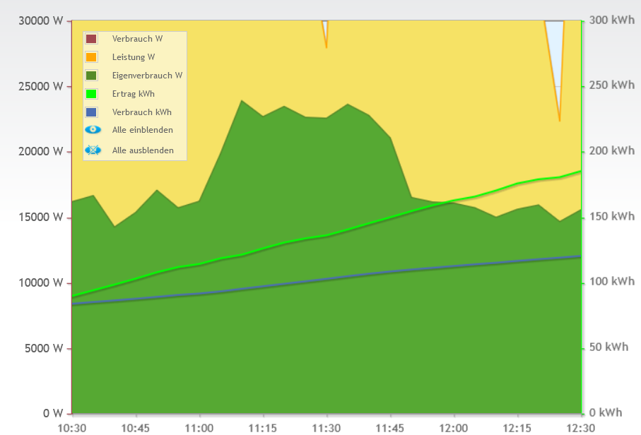 Der gelbe Hintergrund ist übrigens die Kurve der eingespeisten Leistung der 160kWp-Anlage auf dem Dach![]()