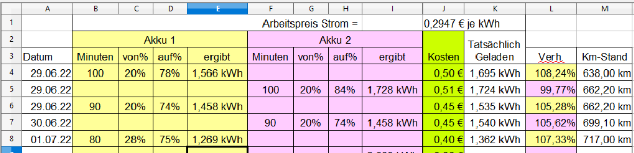 Bis auf den Ausreißer am 29.06.2022 der aber auch auf einem Fehler meinerseits beim Übertragen der %-Anzeige am CPX in die Tabelle liegen könnte, denke ich sogar ablesen zu können, dass die Akkus ein wenig mehr als die 2,7 kWh fassen. (oder?)