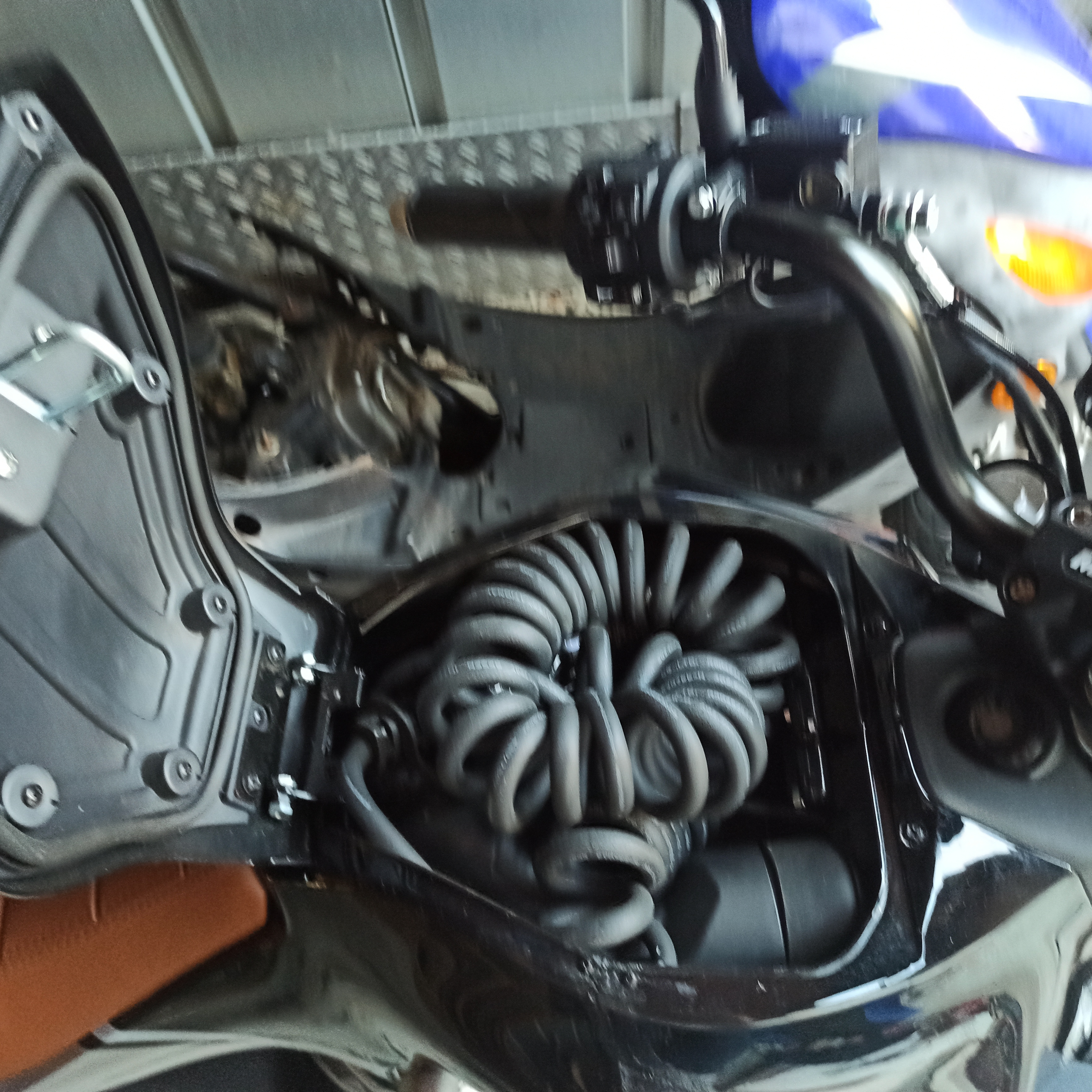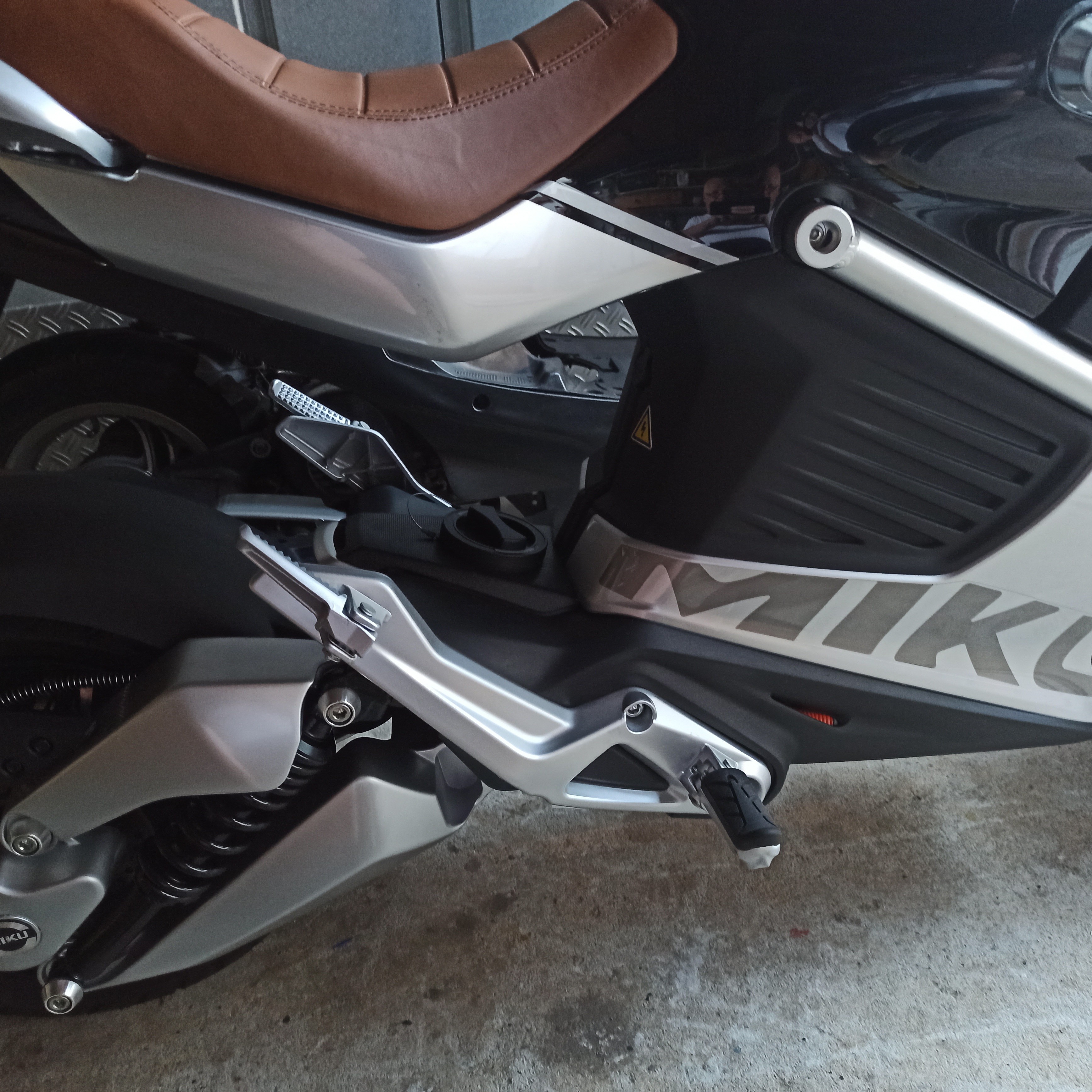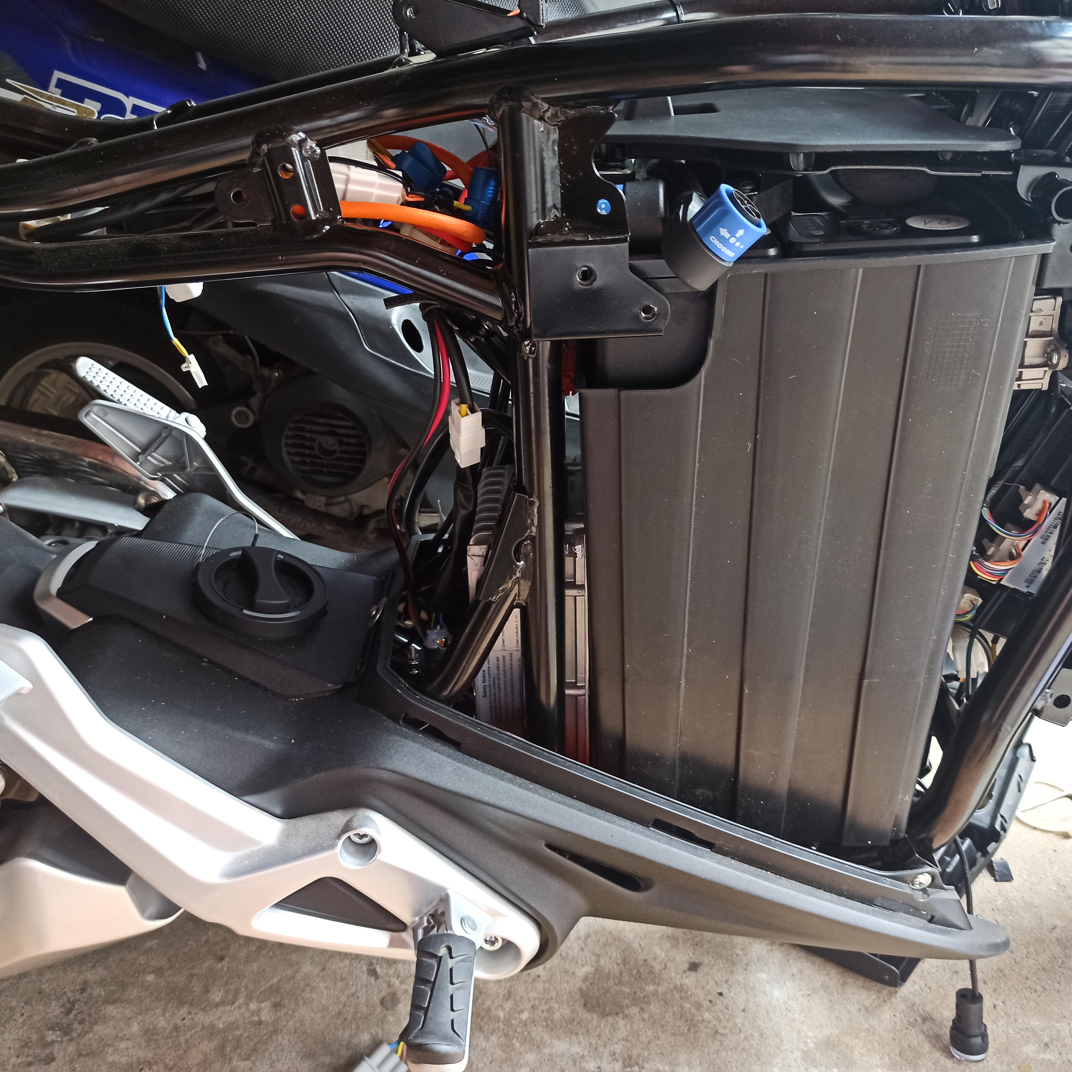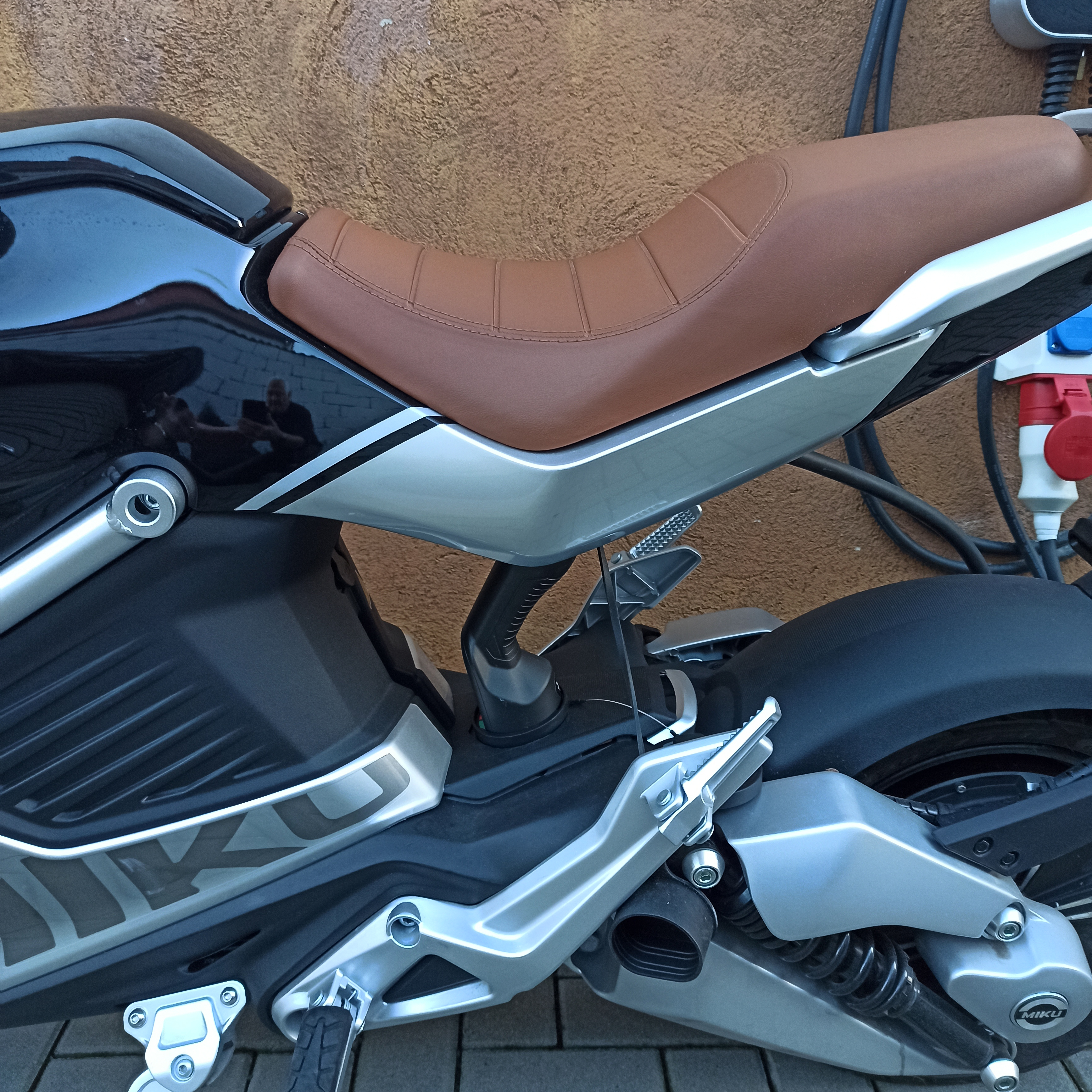 Dann kann der Lader von der Akkukastenseite in den Heckrahmen der Miku Super geschoben werden................. Auf den Bildern sieht man auch wo und wie ich die Typ 2 Anschlussdose eingebaut habe, das geht am besten mit den ausgebauten Verkleidungsteilen, wenn die Dose eingebaut ist, sind die zwei unteren Verkleidungsteile zu einem Teil verschraubt, die Montage ist dann ein wenig tricky, wenn ihr gar nicht klarkommt baut evtl. , vorübergehend den Seitenständer ab!
