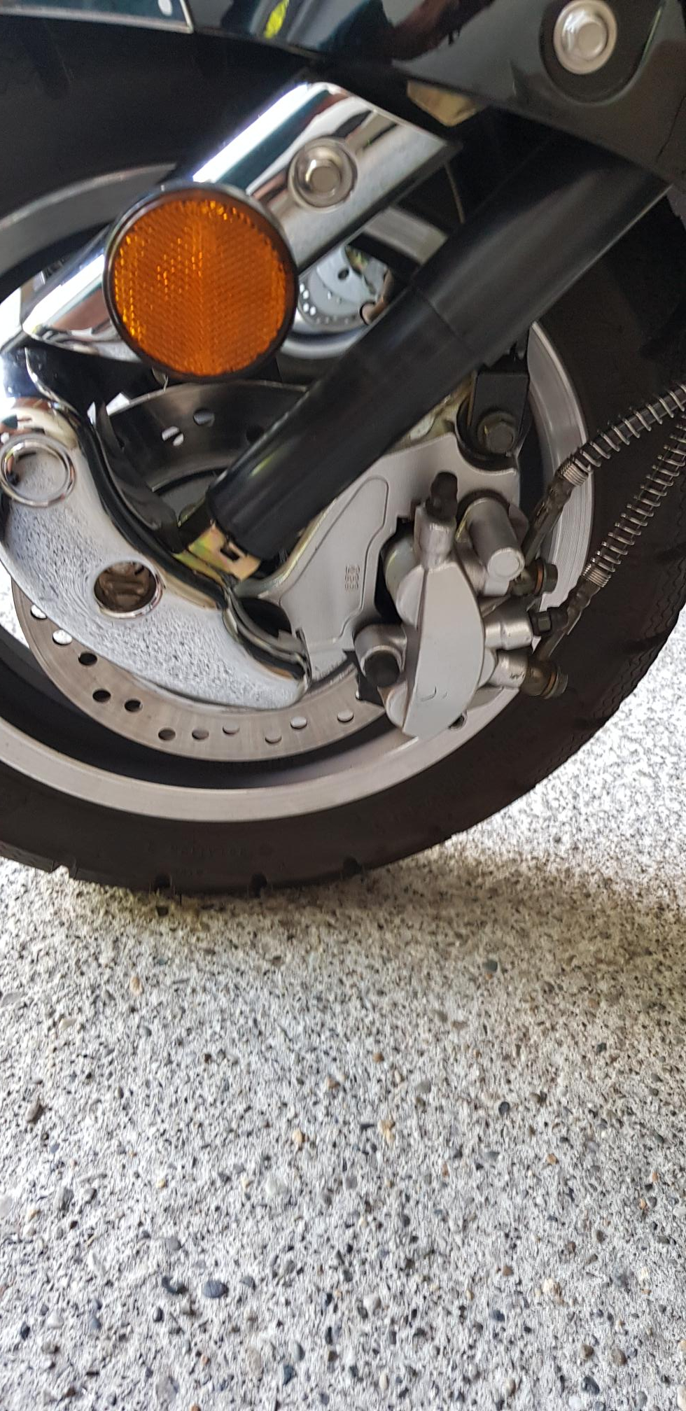 Irritiert fuhr ich langsam an und hörte schon Schleifgeräusche am Vorderrad. Als ich dies näher Untersuchte, stellte ich fest, das der Bremsbelag auf der Kolbenseite sich oben gelöst hatte (unten ist er mit einer Schraube gesichert), ohne den oberen Halt, klappte er um in Laufrichtung und somit war der obere Bremskolben frei und lies sich bis auf die Bremsscheibe drücken