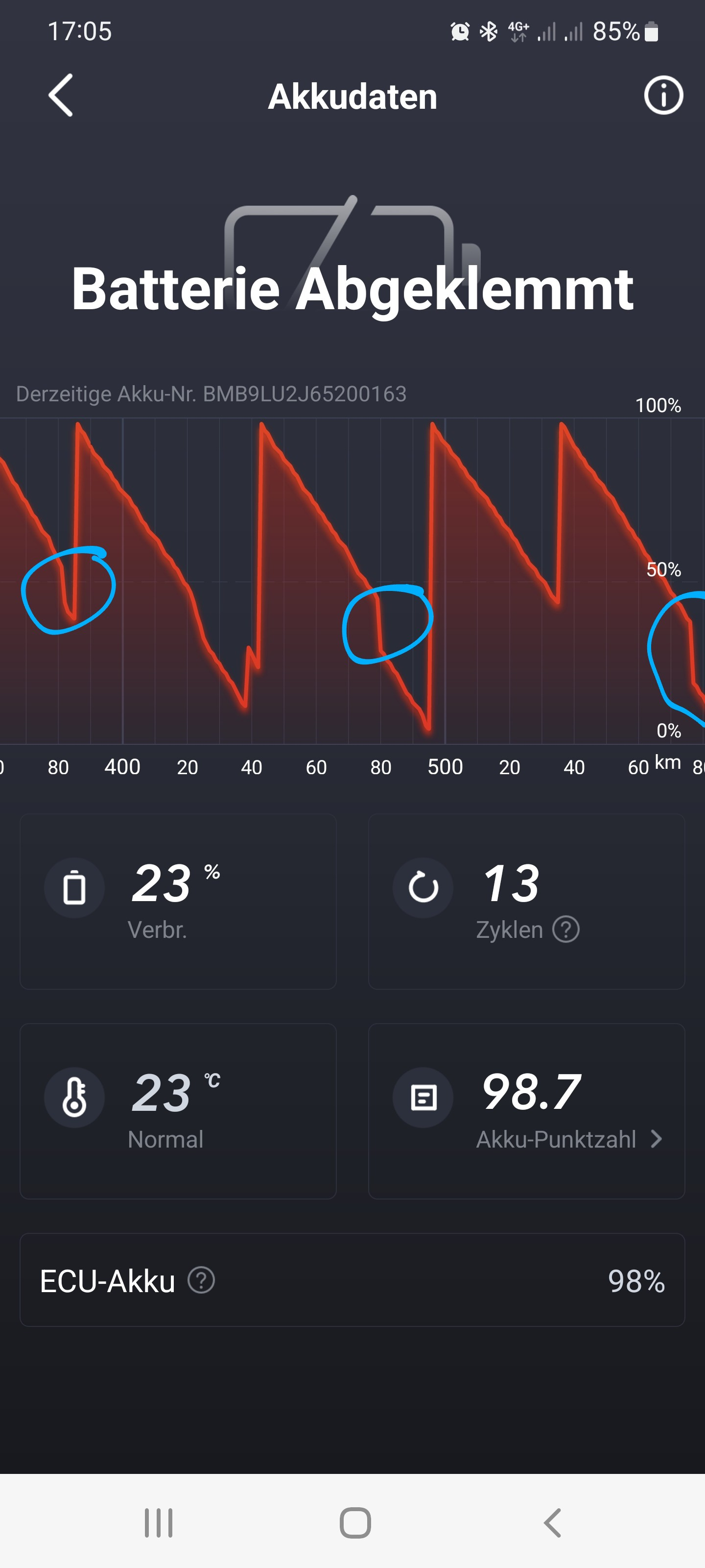 Am Anfang dachten wir, wir sind einfach zu blöd uns den letzten Ladezustand zu merken. Nachdem es nun meine Frau aber 2 mal kaum nach Hause geschafft hat, habe ich in der App auch die Akkustatistik nachvollzogen und sehe dort auch die Ausschläge!