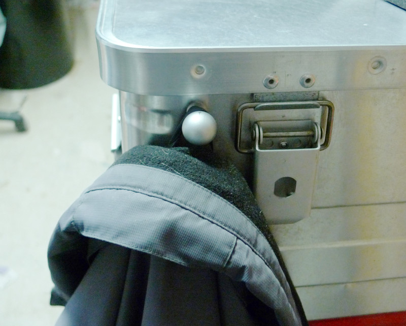 Wer mit einer Jacke unterwegs ist, der möchte sie auch mal ausziehen. Ich habe mir einen Garderobenhaken (kugelförmig) aus dem Baumarkt ans Topcase geschraubt (1 Schraube):