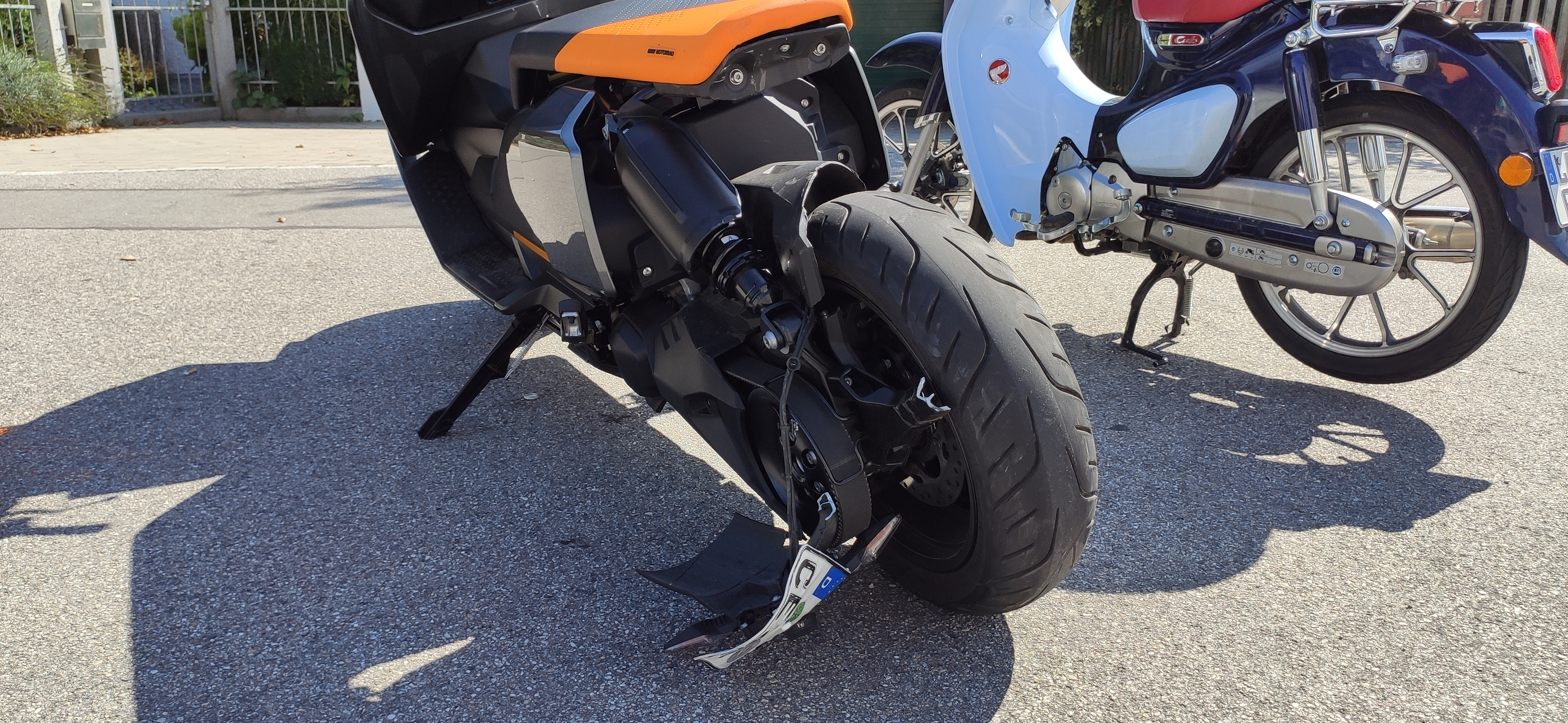 Heute 13:55 Uhr wars so weit... Ein (mein) CE04 ging von uns... an einer Ampel ist mir ein Auto mir guter Wucht draufgefahren... Mir fehlt glücklicherweise nichts, aber der Roller sieht aus... Das Heck ist zerfleddert und auf den ersten Blick siehts aus, als würde das Hinterrad schief stehen... Sollte es das wirklich tun, dürfts ein 'Totaler' sein... Schaun mer mal was der Gutachter sagt...