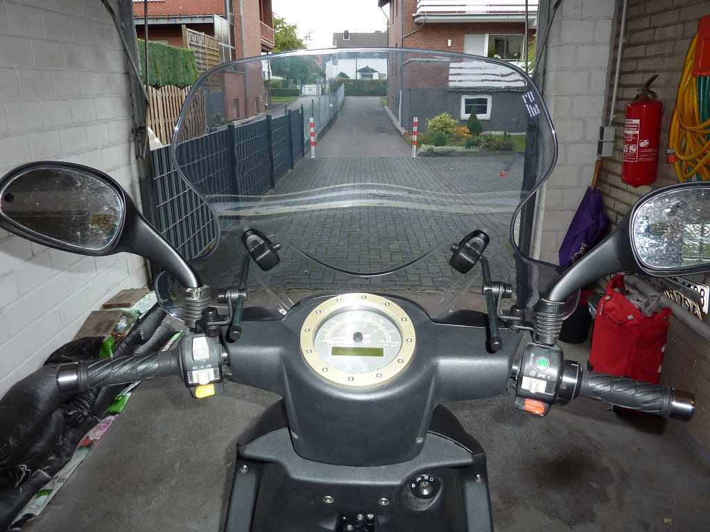Was mir nach den paar Monaten ohne Windschild jetzt auch aufgefallen ist: der Roller kommt mit dem Schild spürbar schneller auf seine 42/48km/h Top-Speed. Ebenso kommt jetzt er schon bei leichten Gefällen in den „Warp-Modus“ und klettert über die 50km/h-Tachomarkierung.