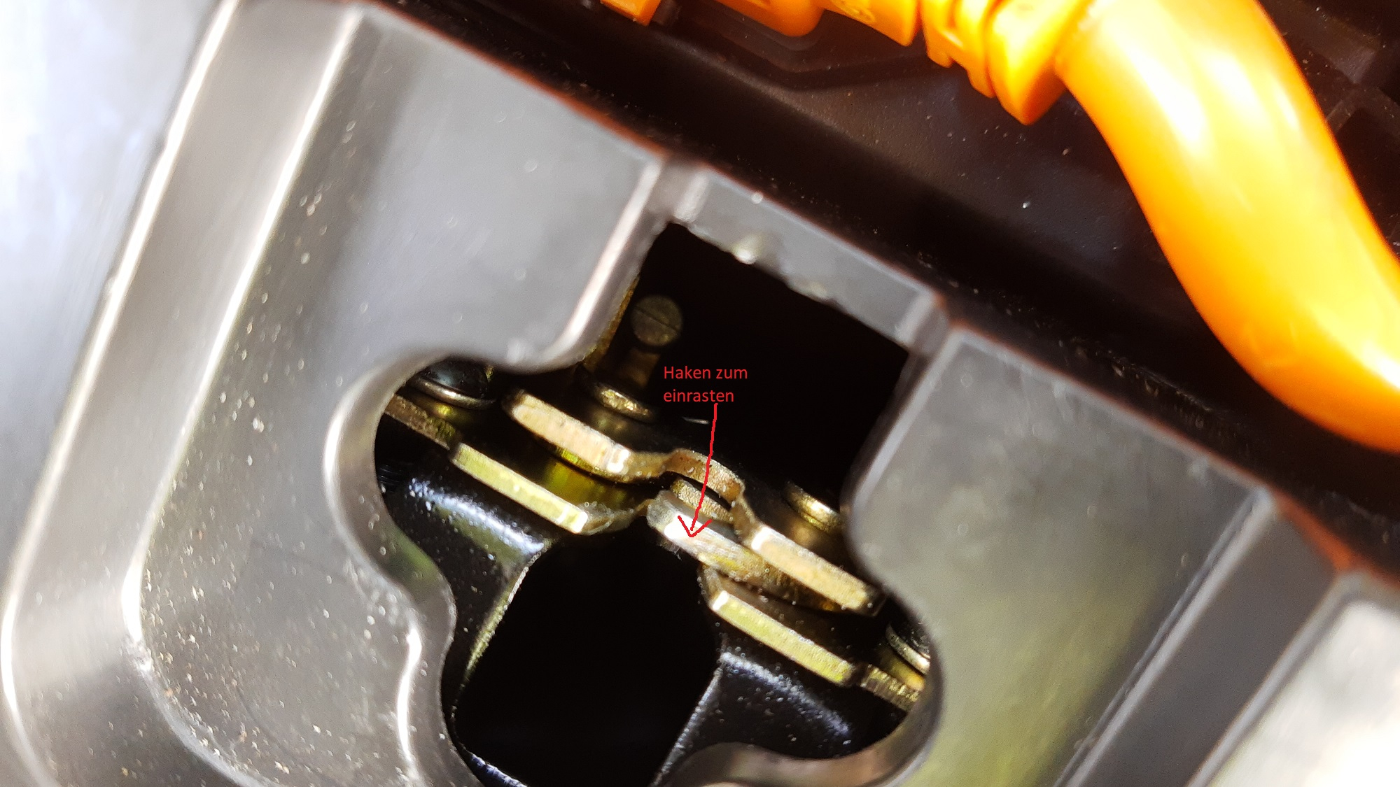Dachte ich kann den Einrastbügel an der Bodenklappe unter die Haken schieben.