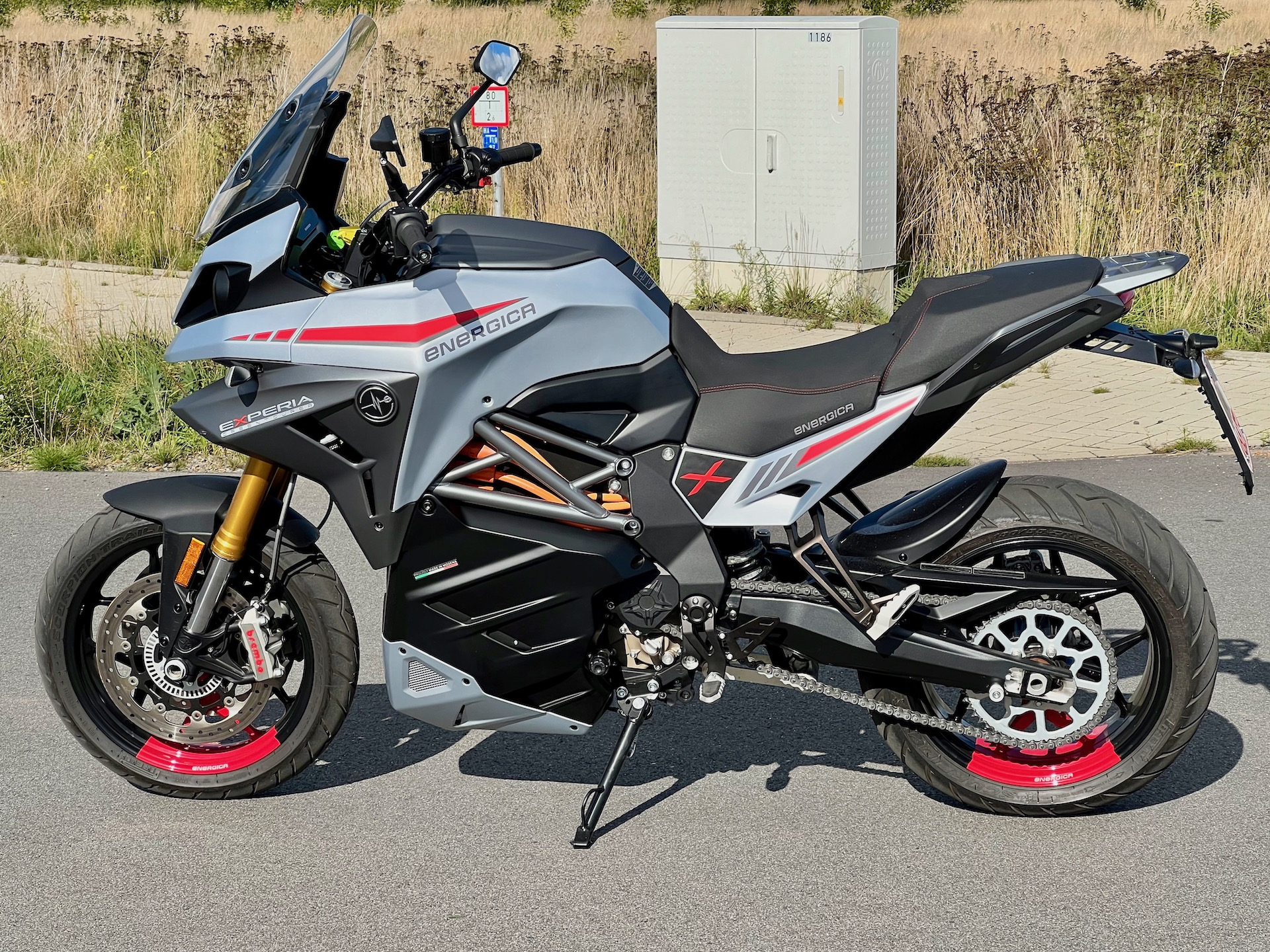 Erst mal im Menü volle Leistung und volle Reku eingestellt, und dann… Herrlich sattes Drehmoment! Kenn ich von der Ribelle, die davon noch ne Schüppe mehr hat. Und dann das Handling - ein Traum! Tiefer Schwerpunkt, gut ausbalanciert, absolut neutrales Einlenkverhalten. UND GENAU DAS HATTE ICH IN MEINEN 3 JAHREN ENERGICA VERMISST. Die Experia fährt sich auf den ersten Metern quasi wie ein Mountainbike. Gedacht, gelenkt, gefahren. Dieses Verhalten bleibt bis etwa 110km/h gleich, soweit eben wie ich es testen konnte. Die Ribelle liegt zwar noch satter auf der Straße, sie braucht aber mindestens 40 oder 50km/h, um danach erst neutraler zu werden. Und sie lenkt sich nicht so leicht. Die Experia zeigt das spielerisch-leichte Lenkverhalten** quasi aus dem Stand schon. Das konnte auch meine GS nicht besser!