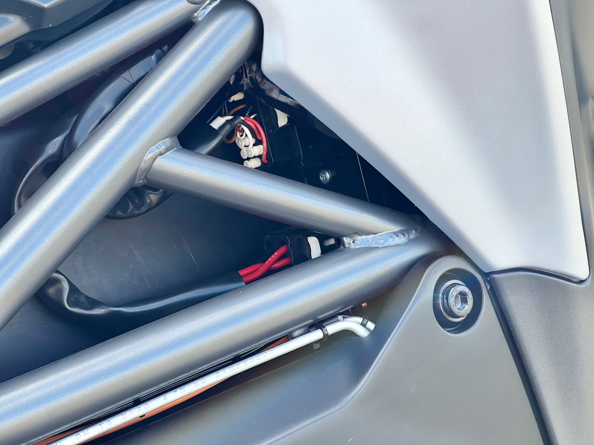 Leider geht es bei der Elektrik weiter: Man sieht die orangen Kabel, was ja an- und für sich okay ist. Aber sie sind doch recht lieblos verlegt. Zudem rechtsseitig Kabel, wo die Schutzhülle mehrere cm vor dem Stecker endet. Und ein, tja, was war es… Codierstecker? Da sah man einzelne Litzen.