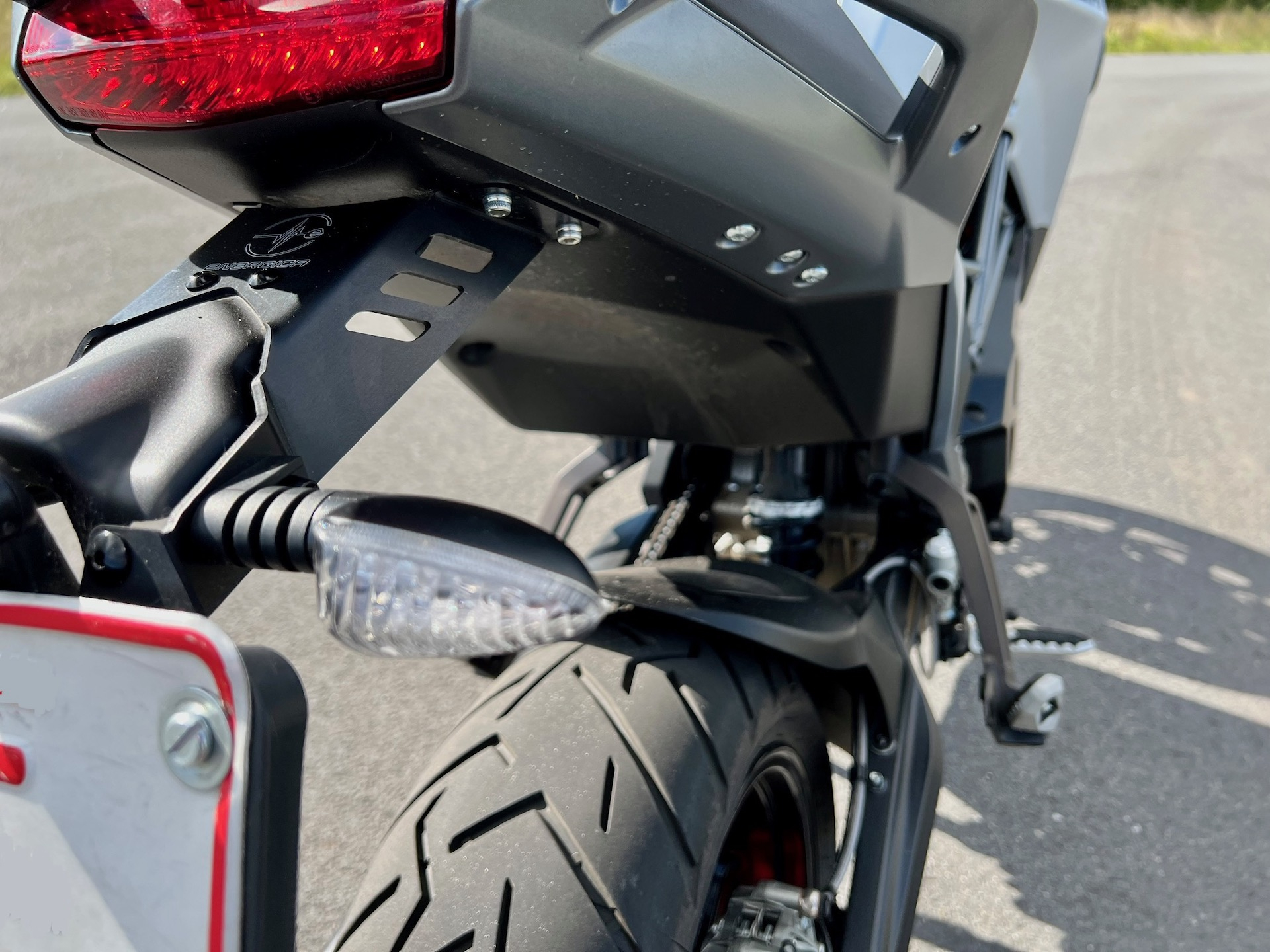 Sämtliche Rahmenschweißähte scheinen von Schweißlehrlingen angefertigt worden zu sein - alles andere als gleichmäßig. Kein Vergleich zu meiner Ribelle, auch die aktuellen Aussteller (Ribelle und EsseEsse) beim Händler haben deutlich sauberere Nähte. Energica kann es also - was sie aber leider bei der Vorserie nicht demonstrieren. Zudem habe ich insgesamt kaum noch aus dem Vollen gefräste Teile gesehen. Man sieht, dass Energica hier den Sprung zum echten Serienhersteller vollzogen hat. Vergleich Ribelle: Lenkerklemme, Fußrastenanlage Fahrer & Beifahrer, Bremssattelaufnahme hinten… alles gefräst. Bei der Experia alles gegossen. Es wirkt halt nicht mehr so exklusiv wie an der Ribelle - ist aber durchaus hochwertiger Standard. Aber immer noch liebevoll gelasert: Der Heckausleger/Kennzeichenträger
