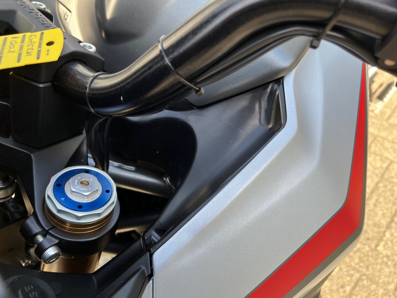 Bei der vorderen rechten Kunststoffverkleidung ist die Passung unsauber und es gibt einen auffälligen Versatz, aber mochmal: Vorserie! Hier würde ich erwarten, dass das für die Serie abgestellt ist. Der Lack macht einen „dünn rübergejauchten“ Eindruck. Dass die Kunststoff-Auskleidung um den Lenkkopf noch nicht genarbt sondern strichpolierte Oberflächen hat, liegt zweifellos auch noch an der Vorserie. Da kommt sicher noch eine einfache Erodiernarbe drauf, das wirkt dann erheblich wertiger. Es gibt viele recht großflächige Kunststoffteile, die eher billig klingen, wenn man mit dem Fingernagel dagegen trommelt. Nicht, dass ich jetzt der große Finger-Trommler wäre, es sind aber alles Punkte, wo es doch mit wenig Aufwand besser geht…
