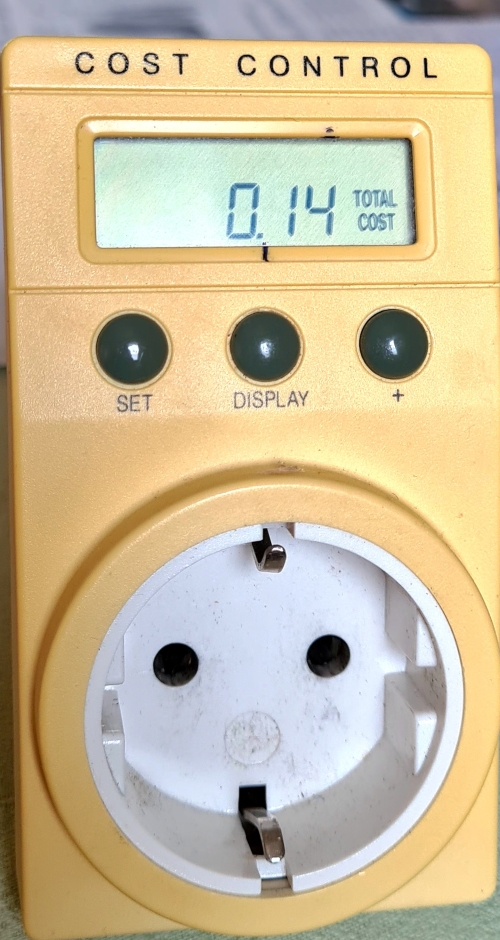 Bei diesem sehr genauen Uralt Schinken kann alles auch 2 oder 3 Std nach dem aufleuchten der grünen Lampe noch am Netz bleiben, dann ziehe ich den Zähler vom Netz ab und kann in diesem Fall den Verbrauch von 0,14 ablesen. Da der Wert auf 1,00 programmiert ist, handelt es sich hier um 140 Watt. Das ist der Verbrauch vom E Bike für 6 km.