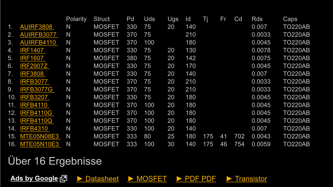 Habe mir einen defekten Flex tech eco flash 2000 mit einer Laufleistung von gerade mal 1300km gekauft. Leider ist der Roller defekt. Die Akkus konnte ich mit dem Ladegerät aufladen habe alle über 12,7 Volt. Leider macht er nichts wen ich gasgebeb möchte. Habe alles getestet außer dem Controller. Heute habe ich den Controller ausgebaut und geöffnet. Es sind zwei 1000uf 63v Kondensatoren aufgebläht und noch zwei 470uf 63v die kann man ja schnell tauschen. Leider hat es von den Mosfets auch einen zerrissen weis noch nicht ob nicht noch mehr von den Mosfets defekt sind. Es sind IRF1407 verbaut. Meine frage gibt es alternativen zu den IR1407? würde gerne stärkere einbauen die auch alle dann neu sind. Habe einen Kandidaten gefunden weis nur nicht ob das geht. IRF3808PbF Könnte mir jemand einen Tipp geben danke