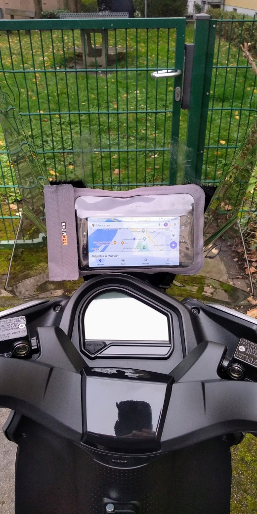 Habe heute einen Teil eines Besenstiels geopfert, um eine Handyhalterung zwischen den Metallstreben der hohen Scheibe anzubringen. Die Smartphonetasche wird noch ersetzt werden, durch eine mit mehr Features. Wichtig für mich vor allen Dingen zusätzlicher Staurum und kleineres Aussenmaß. Nennt sich: "crivit Fahrrad-Smartphonetasche, mit Fenster zur Bedienung"