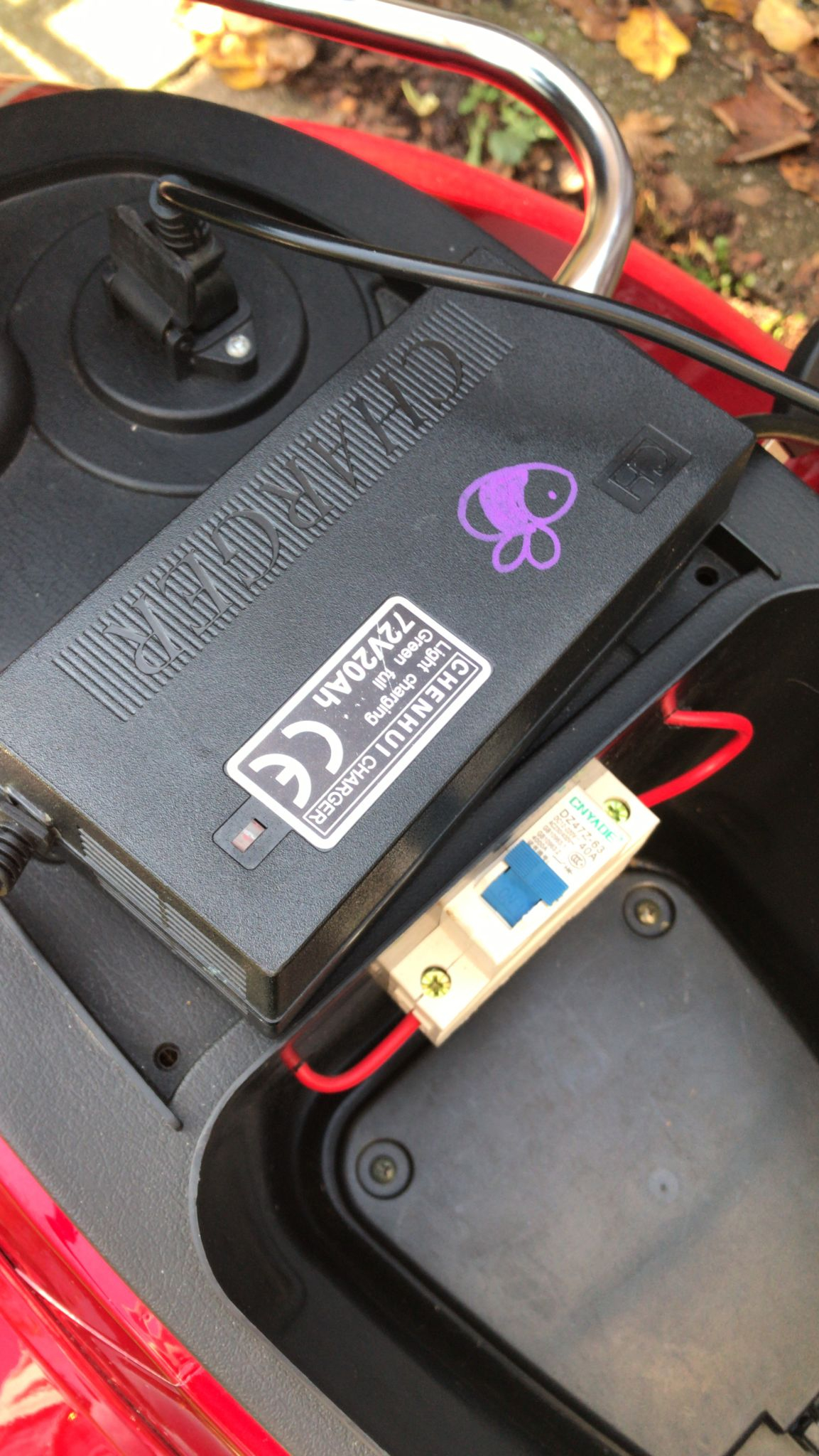 Es handelt sich um eine ältere Variante mit fest verbauten Bleiakkus (dürften 6 Stück Motorradbatterien sein?), geladen wird über einen "verkehrten" Netzstecker unterm Sitz mit einem einfach anmutenden Ladegerät mit roter und grüner LED und Lüfter. Der Tacho ist die digitale Variante anstatt der Analoganzeigen vom neuen Modell.